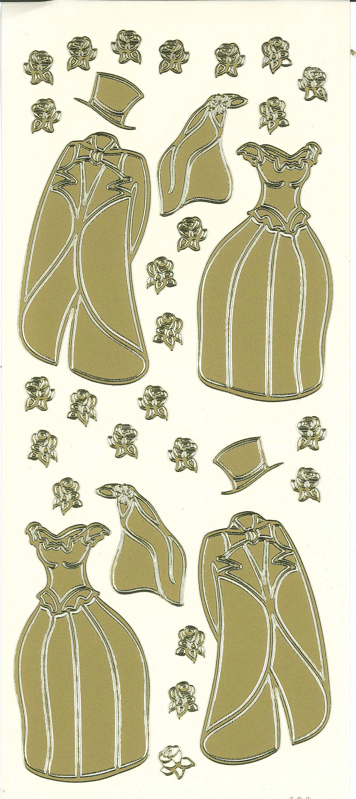 This 4"x9" sheet features wedding attire and flowers to enhance your craft projects! Just simply peel and stick! This package contains one 4"x9" sheet of stickers. 33 images in gold finish.
