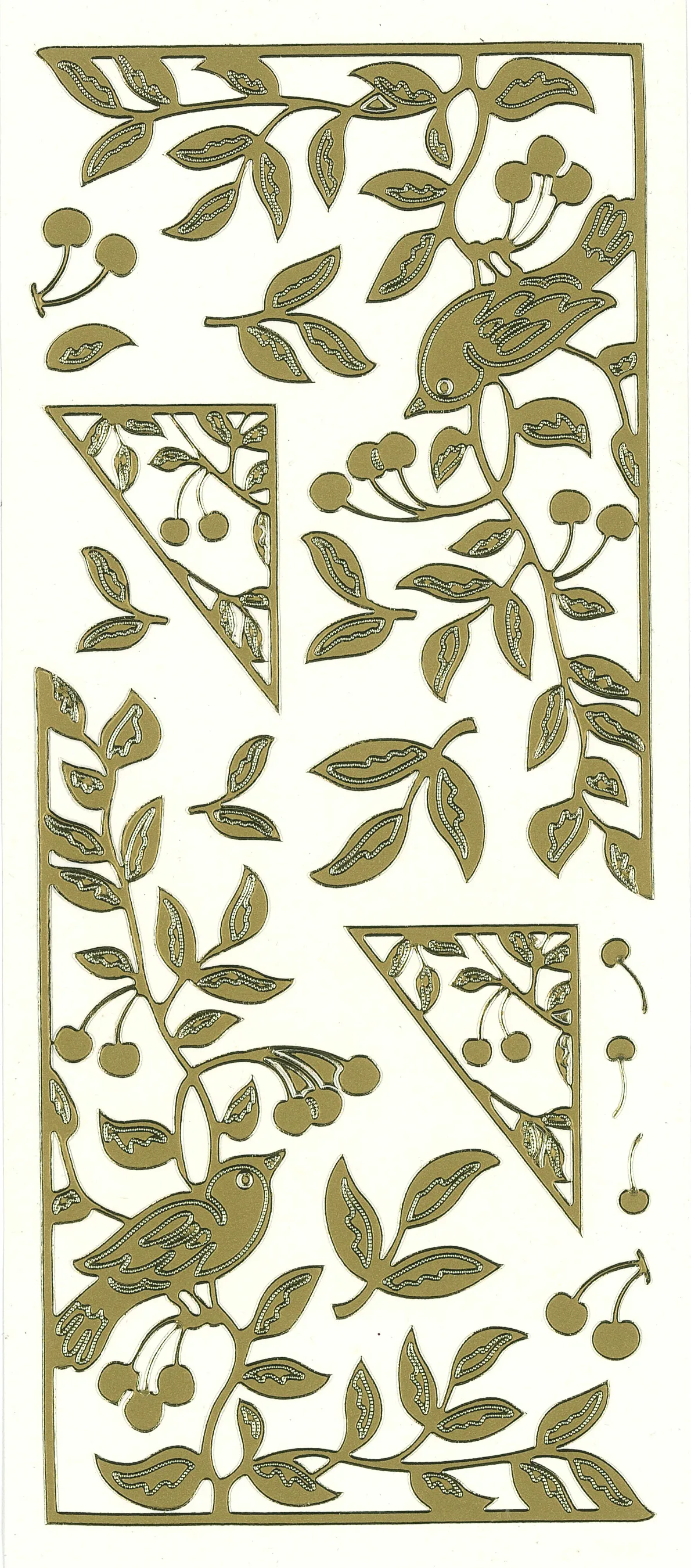 This 4"x9" sheet features beautiful bird corners & and additional accent leaves to decorate your craft projects. Just simply peel and stick! This package contains one 4"x9" sheet of stickers. 16 images in gold finish.