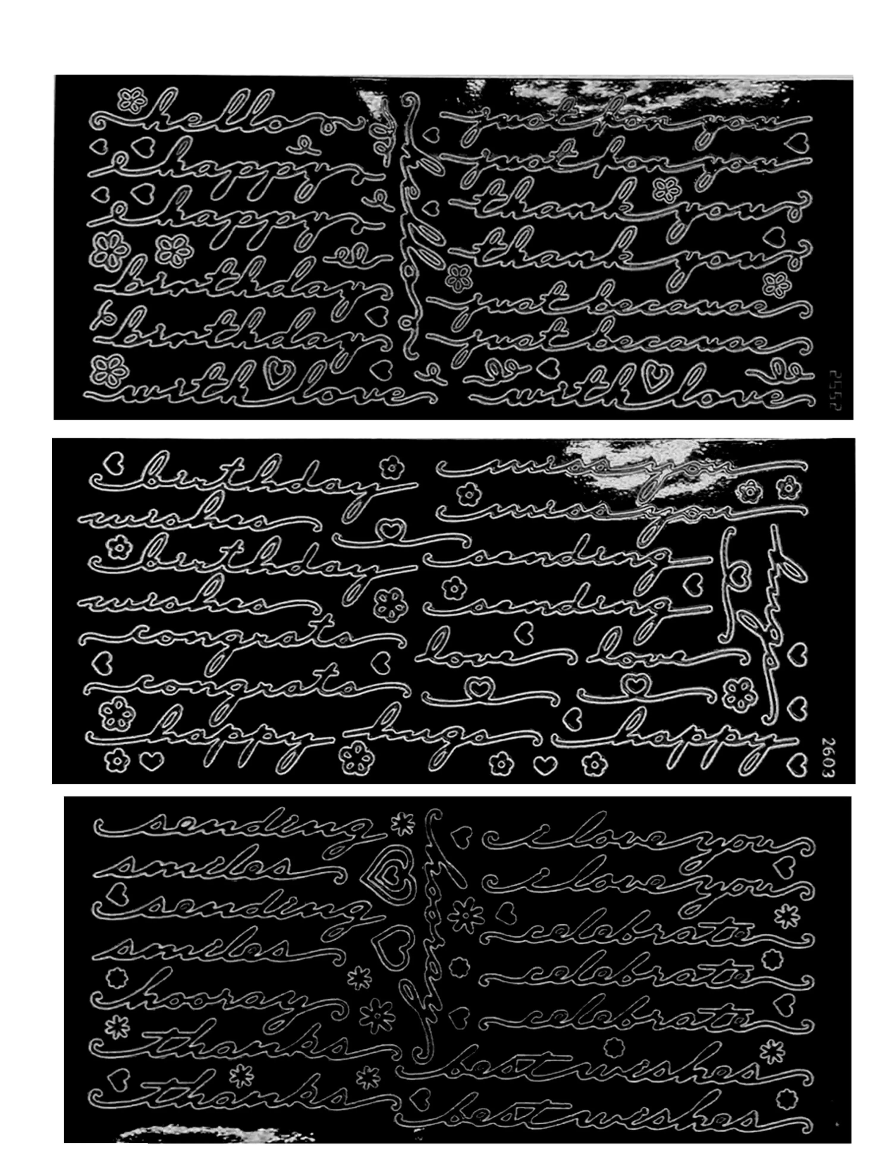 Add elegant script greetings to your handmade cards, scrapbook pages, and junk journals with this beautiful set of black Script Greetings Dazzles™ stickers!