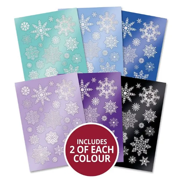 This selection includes 12 sheets, each measuring 8.3"x11.7", all beautifully foiled and die-cut to feature a variety of intricate snowflake designs. Each 220gsm sheet contains 23 different snowflakes, amounting to a total of 276 snowflakes per pack. These sheets are available in stunning shades of blue, purple, black, and turquoise, with each color expertly foiled with silver details. The snowflakes come in various sizes, perfect for creating statement centerpieces or smaller embellishments. Ideal for card making and scrapbooking, these die-cuts can also be used to craft beautiful frames, decorations, baubles, and more, providing endless design possibilities.