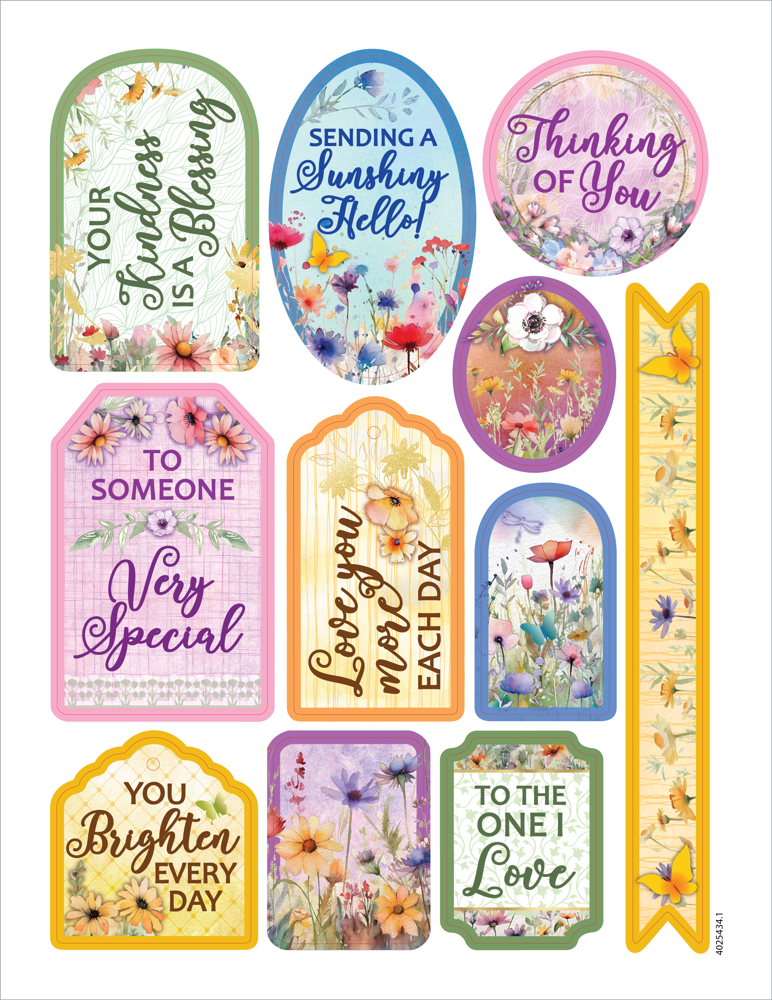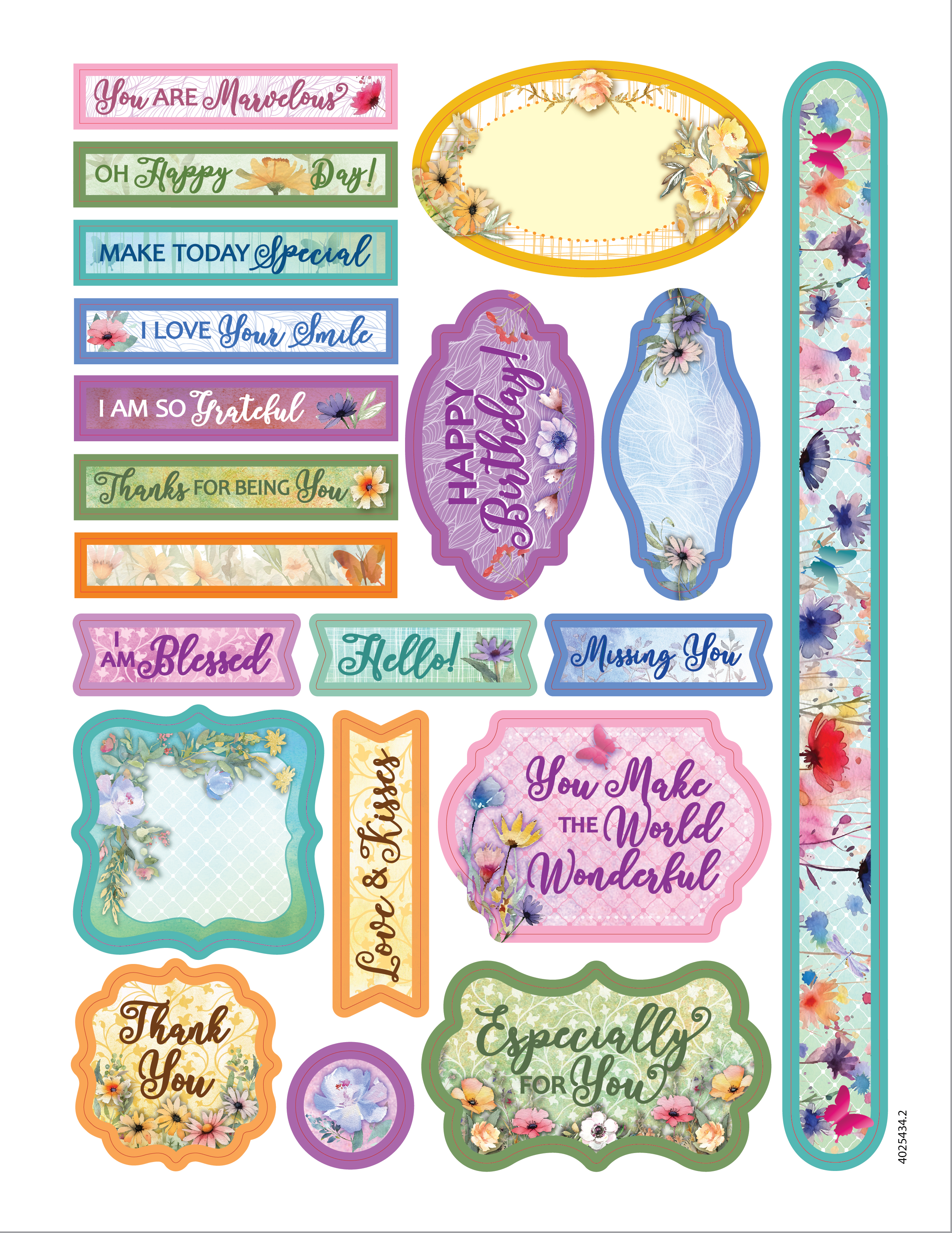 The Watercolor Wildflowers Die-Cuts set includes 31 beautifully crafted pieces featuring soft watercolor floral themes and uplifting sentiments like “I Am Blessed,” “Make Today Special,” and “You Make the World Wonderful.” These die-cuts come in a variety of sizes and elegant shapes, ranging from slim banner strips to ornate labels and scalloped frames, in hues of soft pinks, blues, greens, purples, and sunshine yellow. A few pieces are left blank, perfect for adding your personal touch using stamps, Dazzles™ stickers, or other embellishments. Ideal for card making, journaling, scrapbooking, tags, and more, this collection brings charm and versatility to any paper crafting project. Proudly made in the USA and available exclusively at Paper Wishes!