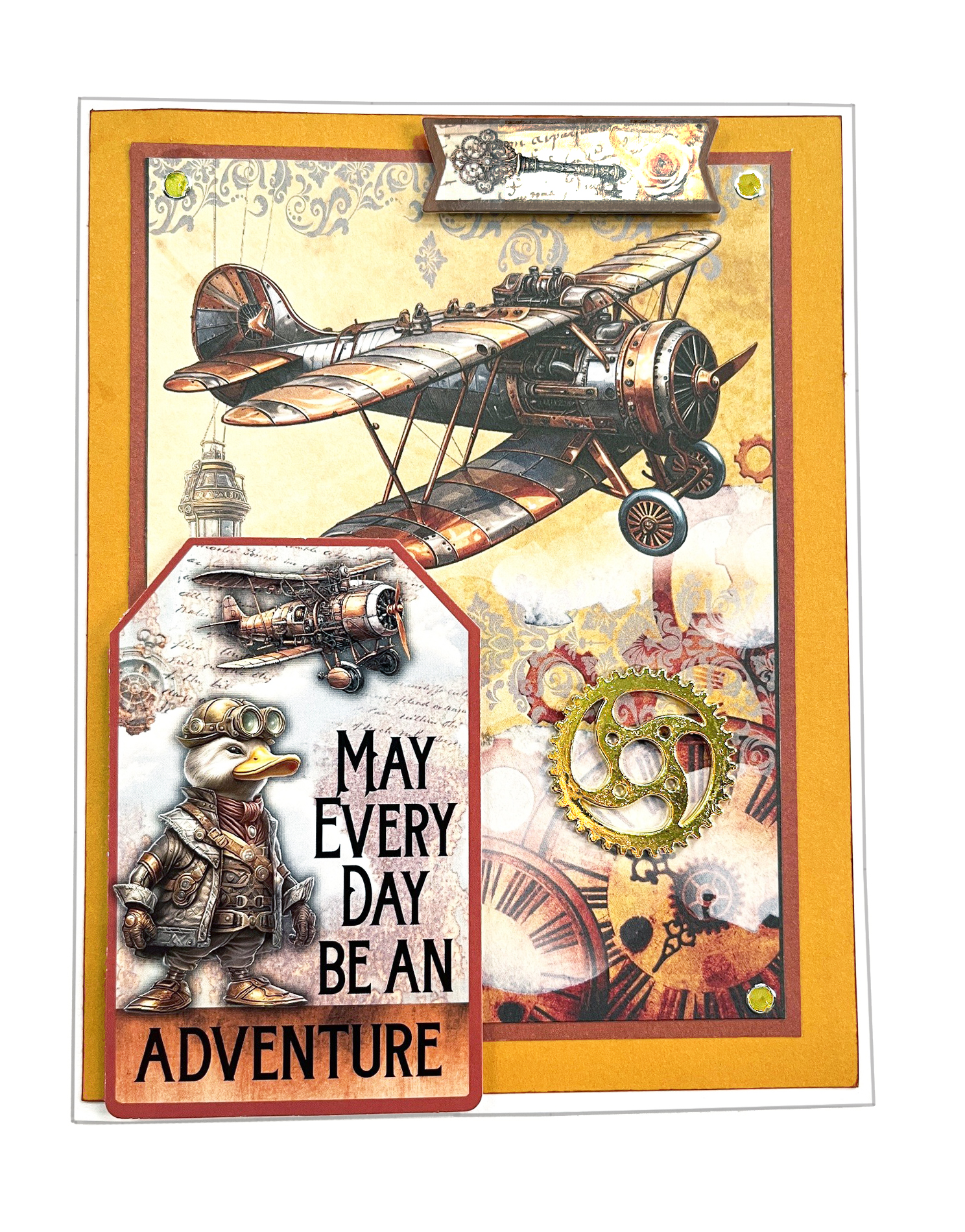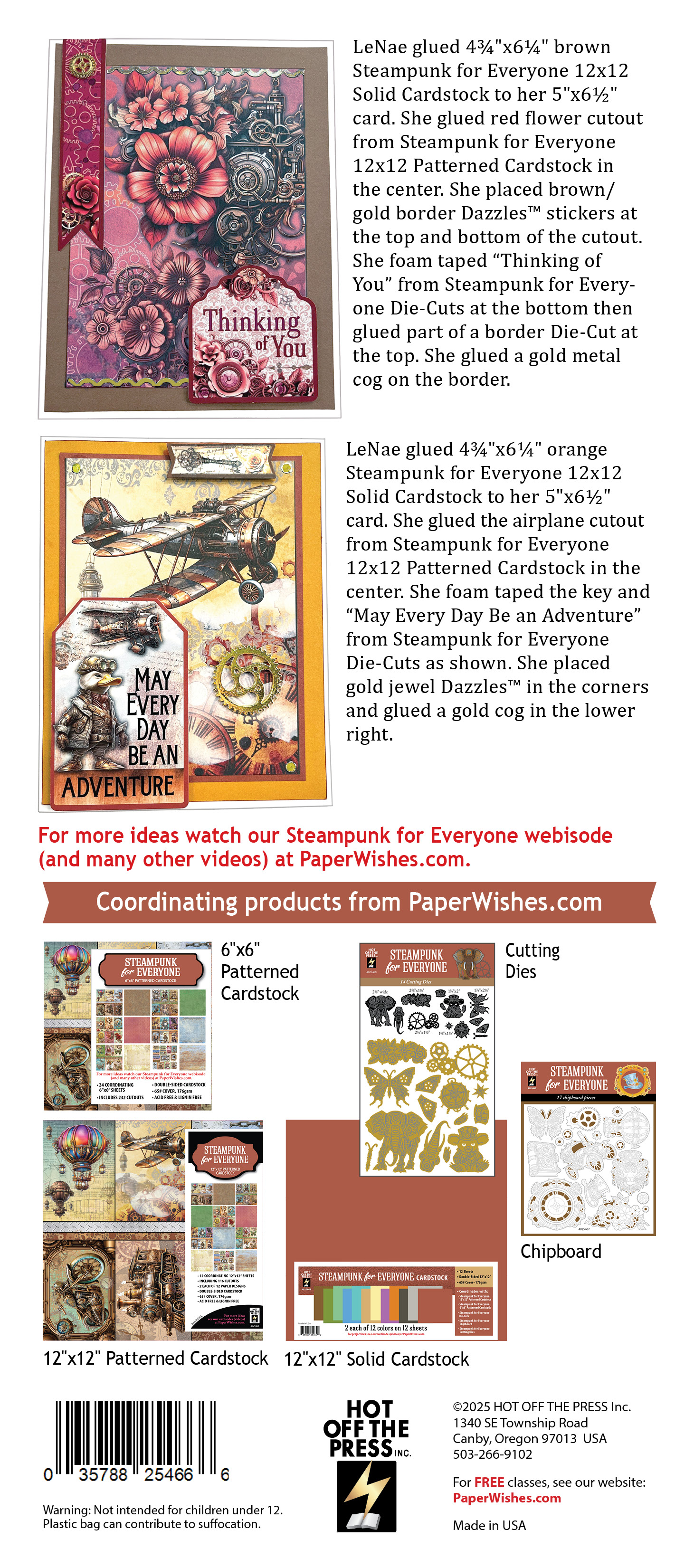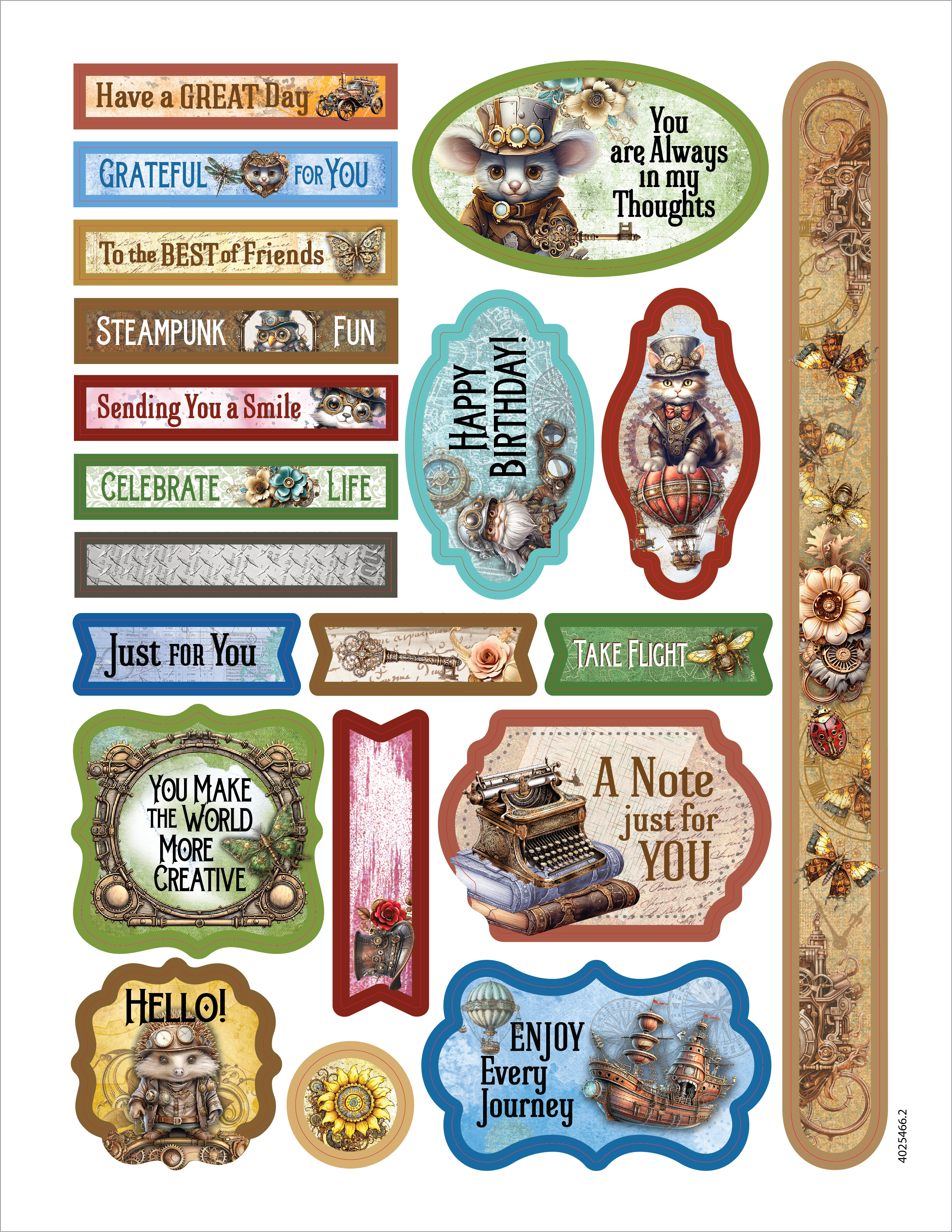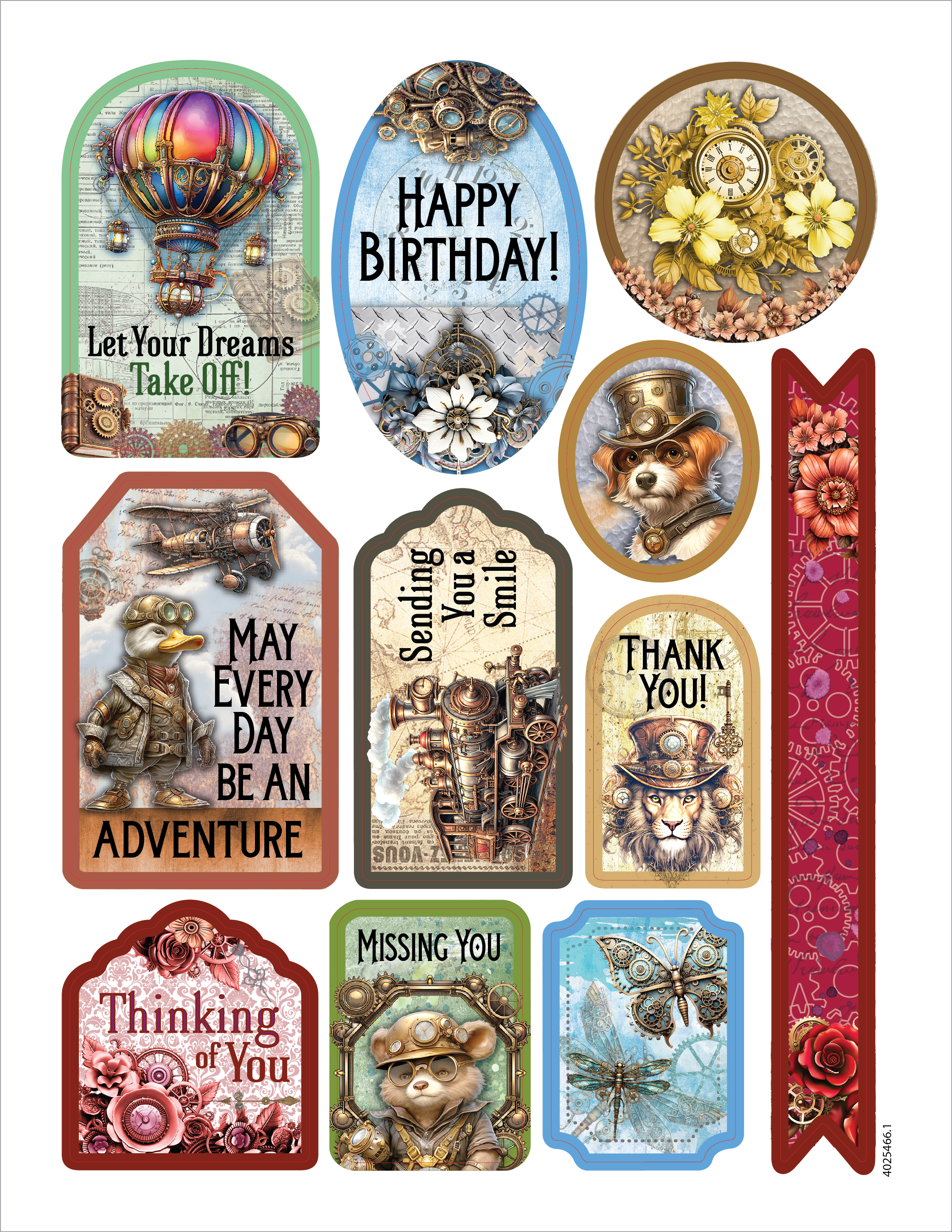 This set includes 31 beautifully crafted pieces, featuring whimsical steampunk-themed artwork such as airships, gears, vintage trains, animals, flowers and butterflies, all accented with florals and heartfelt sentiments like “Let Your Dreams Take Off” and “Thinking of You.” Some die-cuts are left blank for your personalization with stamps, Dazzles™ stickers, or additional die-cut images, giving you endless creative possibilities. These versatile die-cuts are perfect for card making, scrapbooking, tags, labels, and other imaginative paper crafting projects. Proudly made in the USA and available exclusively at Paper Wishes!