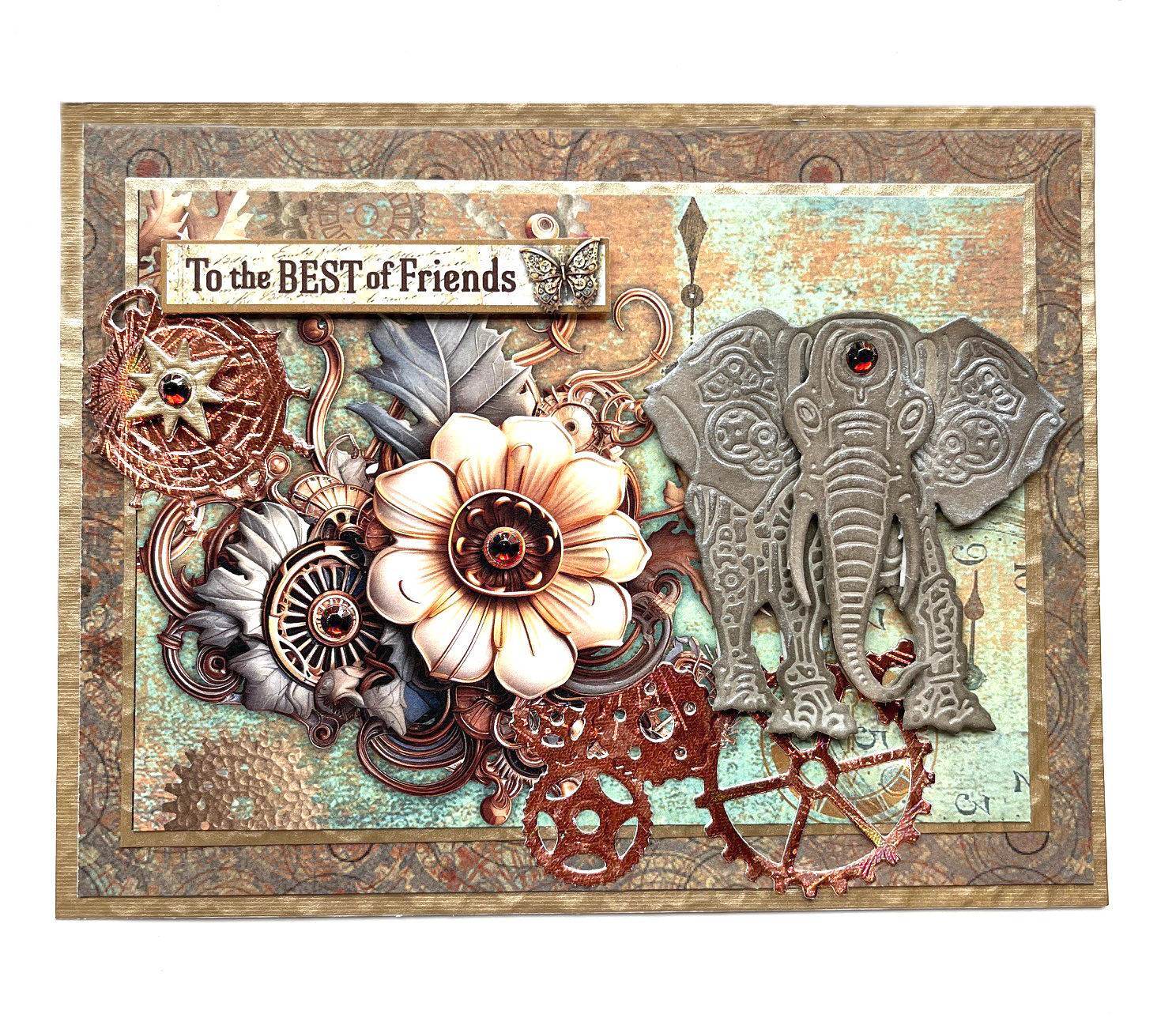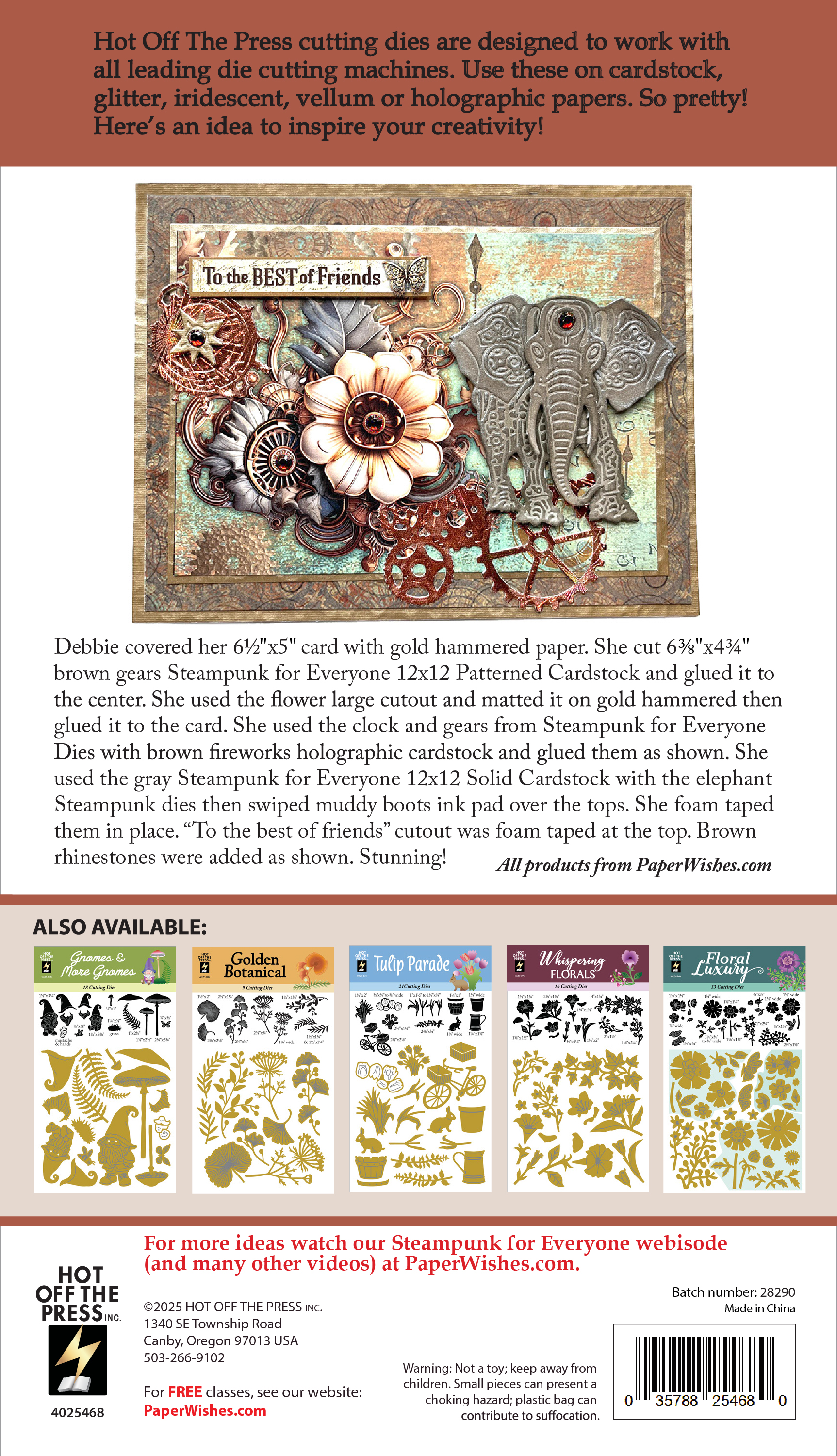 This collection includes 14 versatile pieces inspired by the whimsical and imaginative world of steampunk featuring detailed gears, florals, butterflies, vintage machines, and charming characters like a mechanical elephant and a dapper steampunk critter. Perfect for card making, scrapbooking, journaling, and mixed media projects, these dies bring a dynamic, dimensional element to your crafts. They coordinate seamlessly with the Steampunk for Everyone Collection to unlock endless creative possibilities. The largest die measures 2 5/8" wide and is compatible with