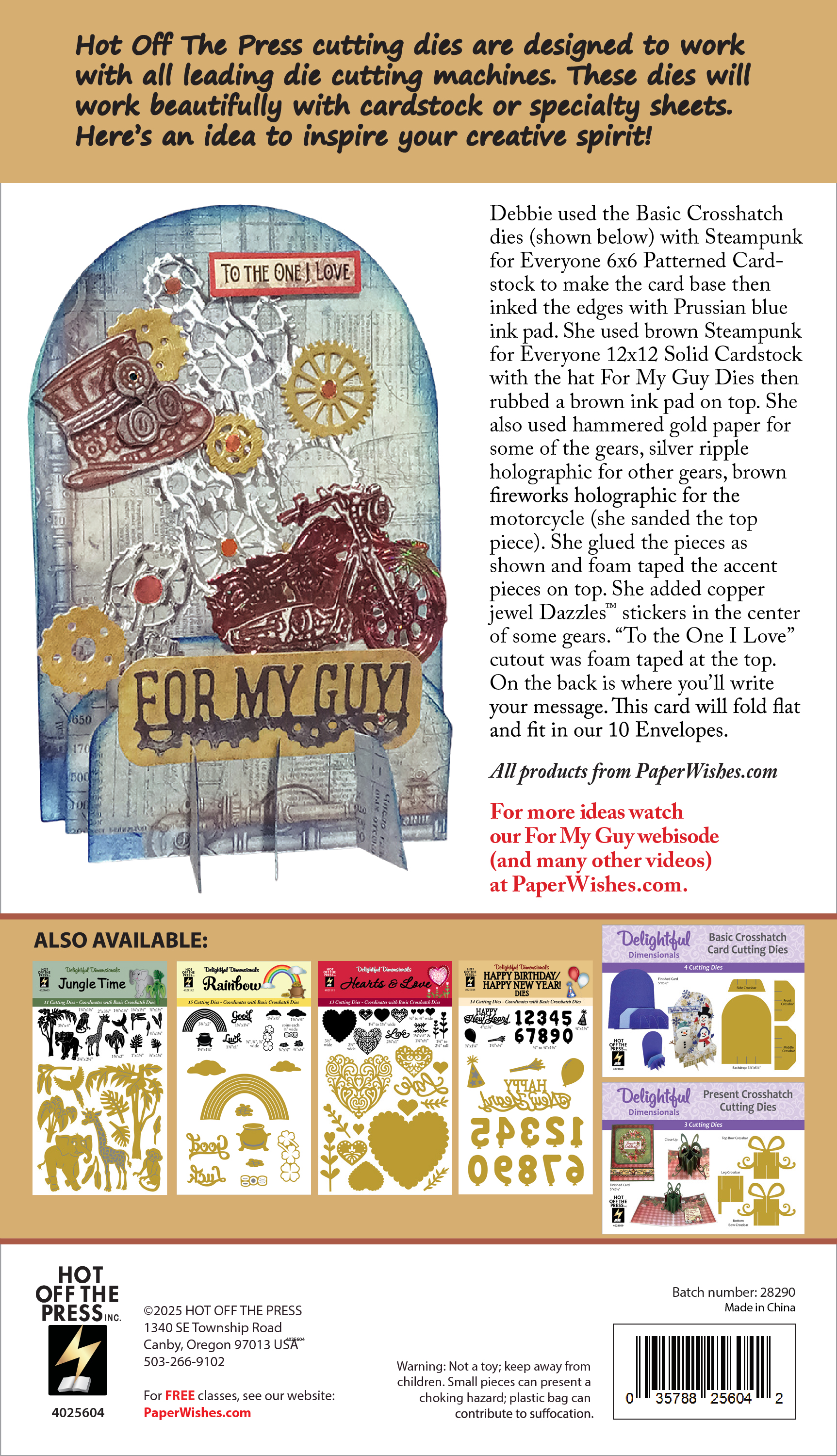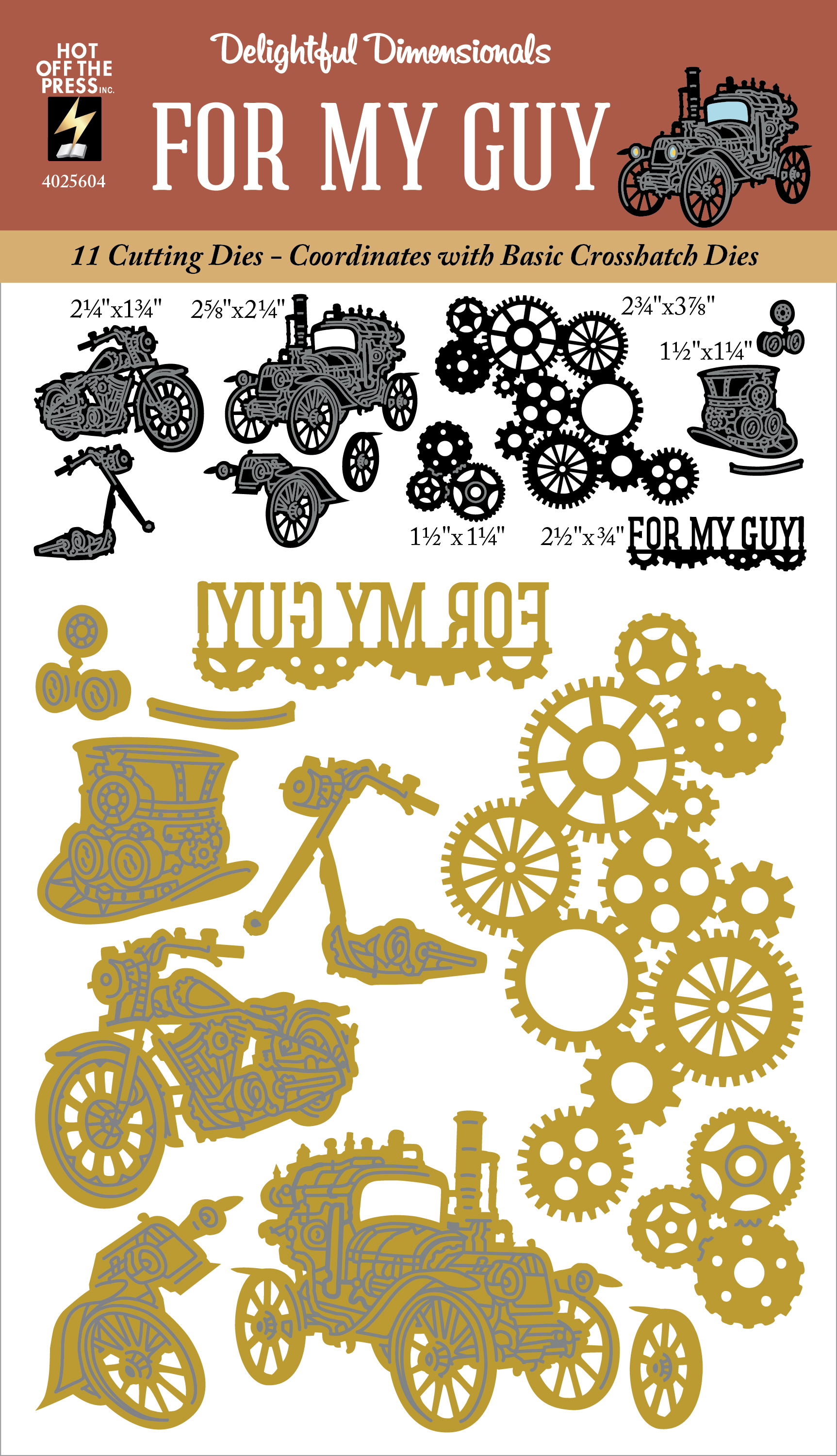 This 11-piece die set features a steampunk-inspired theme with gears, classic vehicles, and intricate details. The set includes designs such as a vintage car, motorcycle, top hat, and gears, with sizes ranging from 1 ½"x1 ¼" to 2 ¾"x3 ⅞". Perfect for creating masculine card making, scrapbooking pages, or mixed-media projects, this set pairs effortlessly with the Basic Crosshatch Card Dies. A sample project and step-by-step directions are provided on the back of the package to spark your creativity.
