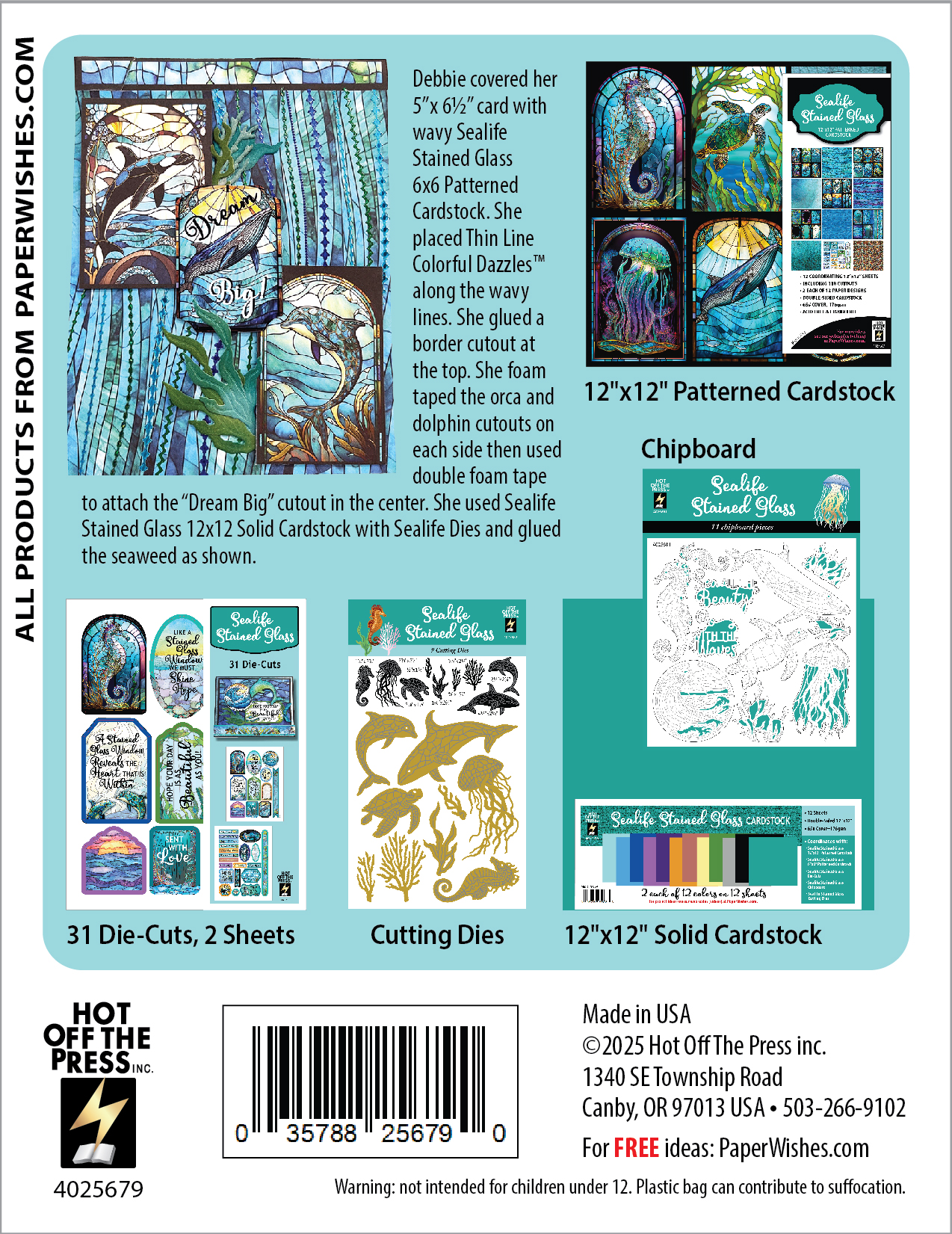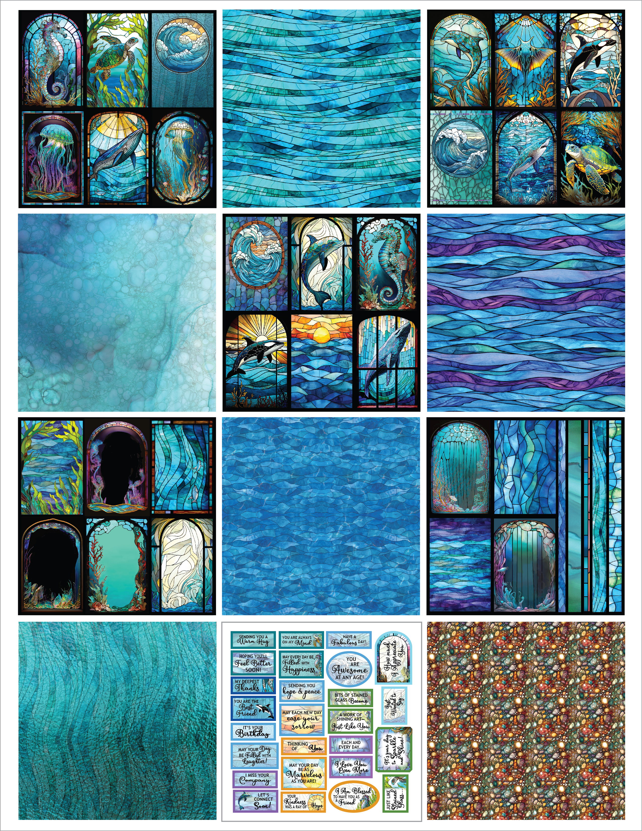 The Sealife Stained Glass 6"x6" Patterned Cardstock pack includes 24 sheets (4 each of 6 mesmerizing designs) on 65# cover weight (176gsm), double-sided paper. Each sheet features rich underwater-inspired stained glass art and vibrant ocean textures. This pack also includes an incredible 236 cutouts, perfect for card making, scrapbooking, or journaling in your papercraft projects. Dive into creativity with this stunning sea-themed cardstock collection! Acid & lignin free. Made in the USA. A Paper Wishes Exclusive!