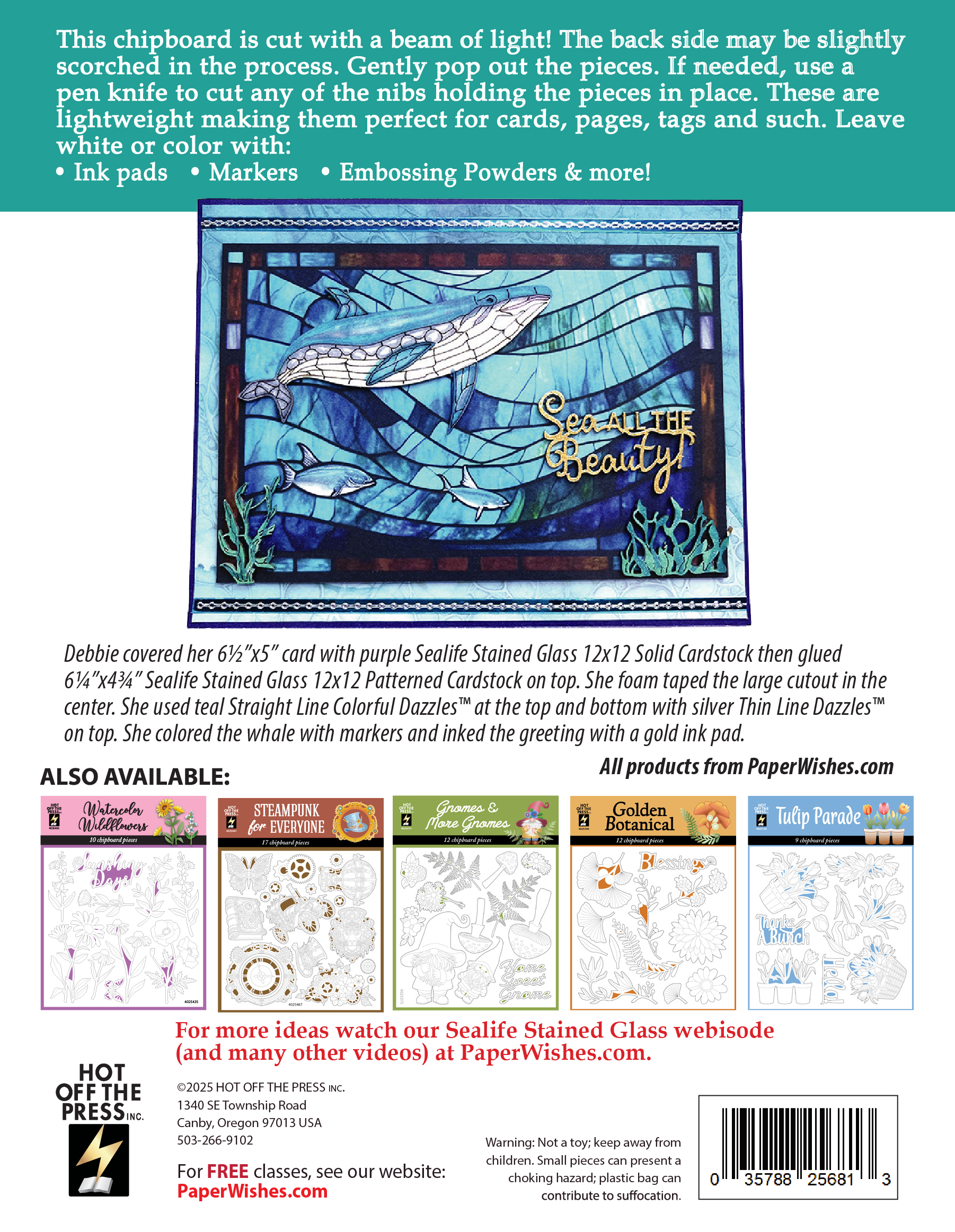 Bring your ocean-themed crafts to life with this 11-piece Sealife Stained Glass Chipboard set! Featuring intricately cut stained-glass style sea creatures and phrases such as “Sea All the Beauty” and “Go With the Waves”, these designs add an elegant and whimsical flair to card making, scrapbooking, and mixed media projects. Use the pieces as-is for a natural chipboard look or customize with inks, markers, paints, or embossing powders. Each piece is laser cut and may have a slightly scorched reverse side due to the cutting process. Just pop them out gently and start crafting! Exclusively from Paper Wishes.