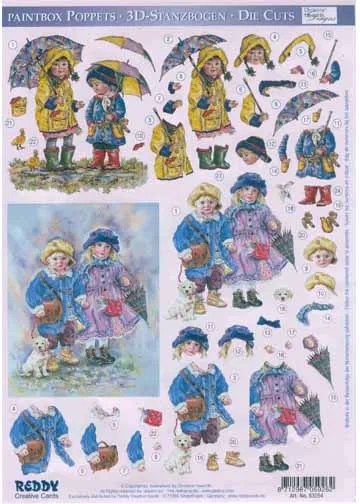 This 3D Precut has 2 different scenes. One is children with umbrellas and little ducks and the other is children holding hands and a puppy. They will make a cute card or accent for your scrapbook pages. Just press out and layer the pieces according to the numbers using foam tabs or 3D glue.