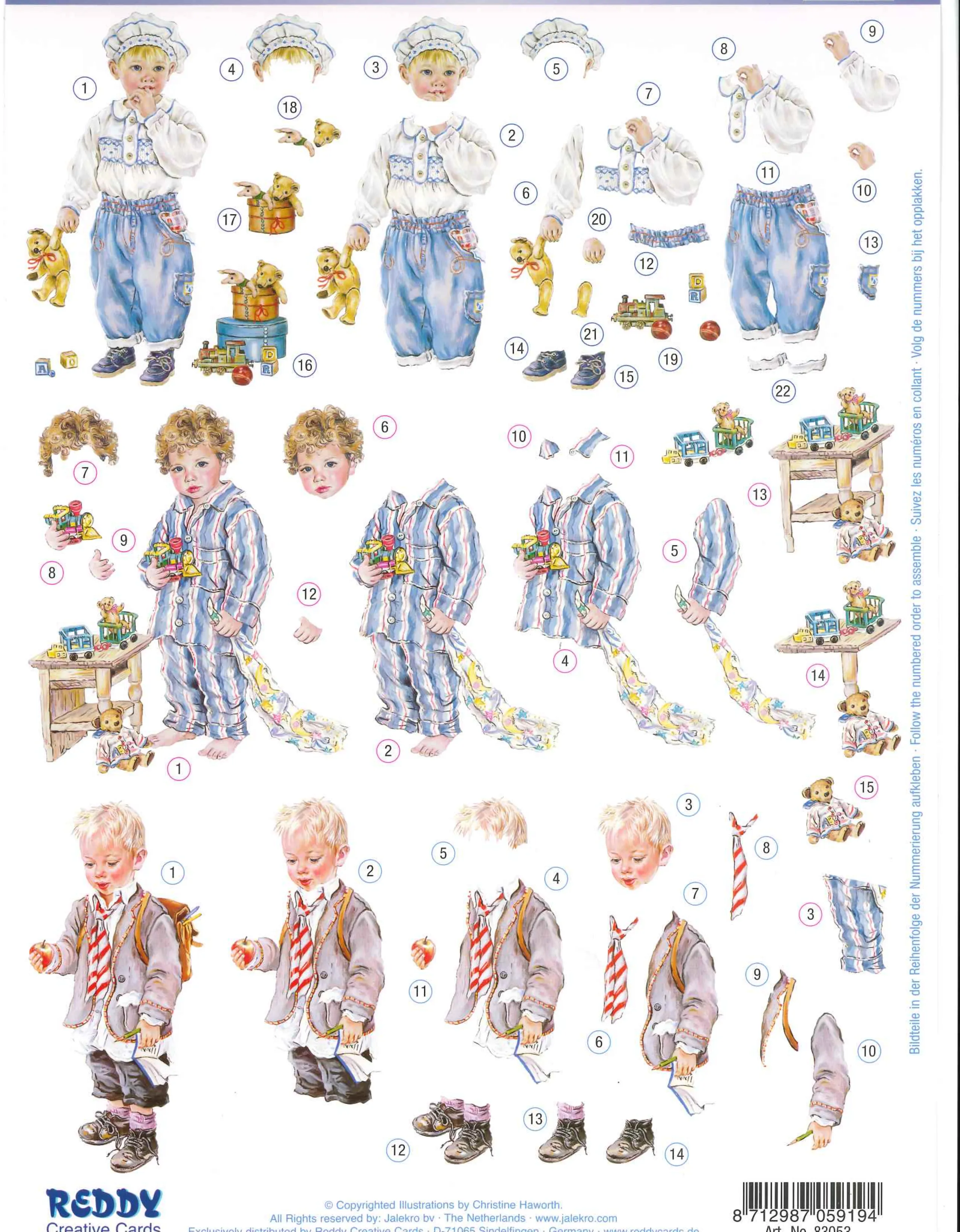 This sheet contains 3 different images of boys. With toys, in pajamas and going to school. They will make a lovely card or accent for your scrapbook pages. Just press out the pieces and layer them according to the numbers using foam tabs or 3D glue.