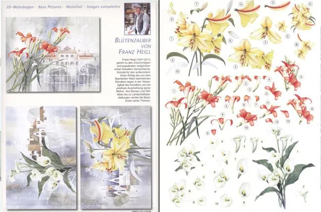 You will be able to create 3 Stunning 3D cards. (2 sheets) Mediterranean style designs in watercolors featuring Calla Lily, Tiger Lilies. To create 3D images press out the pieces and layer them according to the numbers using foam tabs or 3D glue between layers starting with card front on first page.