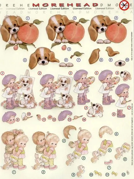 This 3D sheet will make 3 separate cards and requires No Cutting. Just press out the shapes and layer them with foam tabs or 3D glue according to the number. They are so fast and look perfect every time. They have cute little children and animals for your cards or scrapbook pages.