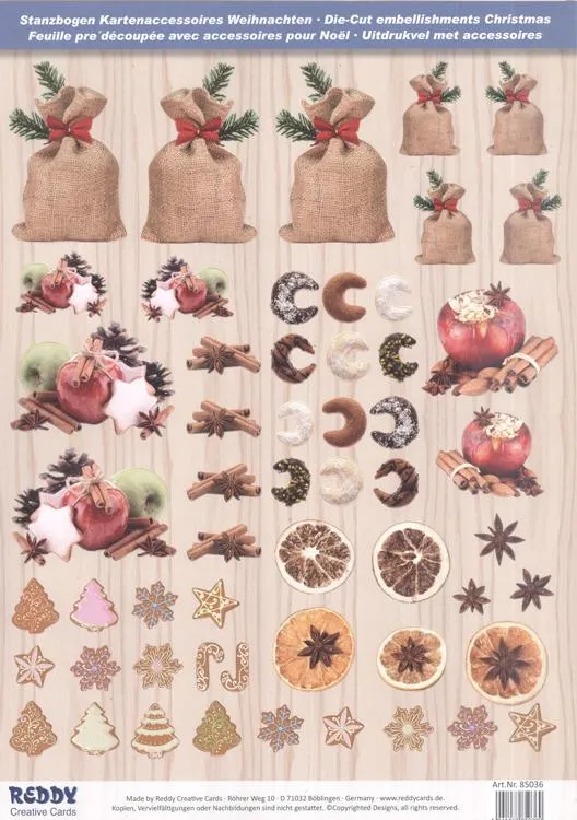 A unique set of die cuts that include burlap sacks in two sizes, fruit, cinnamon sticks and a variety of Christmas-shaped cookies.