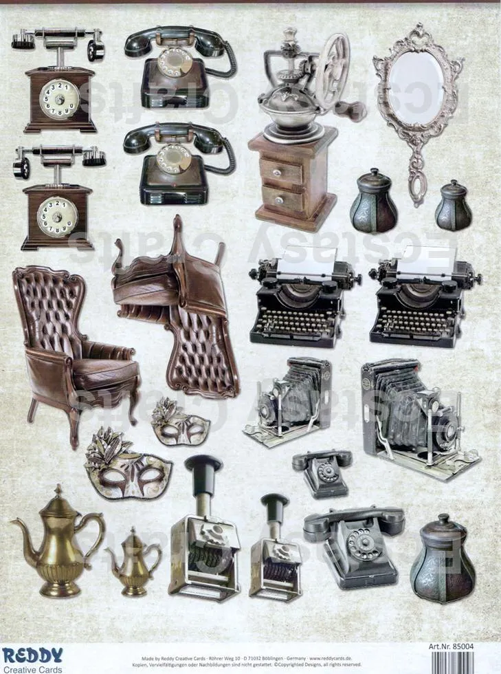 A4 sized smooth, matte cardstock, 250 gsm (heavy cardstock) Pre-punched card accessories of antique items. Can be used as accent pieces.