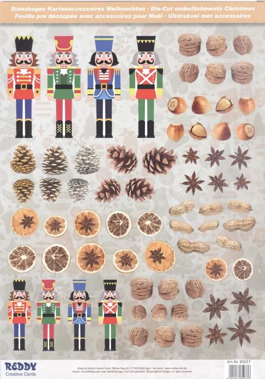 Beautiful nutcrackers in two sizes (4 each) for your Christmas cards, along with a variety of other decorations including fruit, pine cones and nuts.