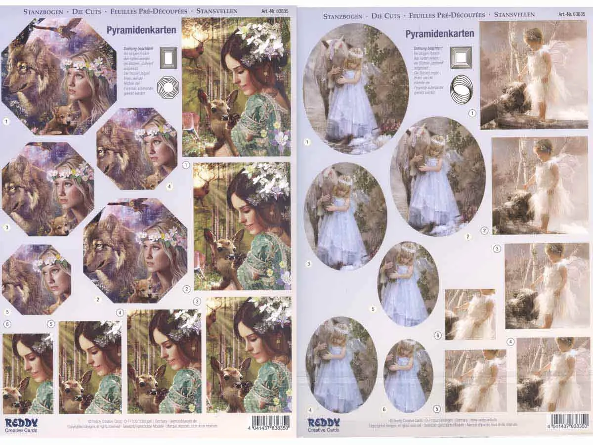 These pyramid sheets are very beautiful, they come with 2 different sheets per package with 2 separate images on each. Assemble by layering, being careful to line up the design rather than the shape. When you are done, you will see a beautiful design on pieces with varying angles which will add extra dimension to your project. Wonderful for cards or scrapbook pages, easy to create, simply press out and layer with foam tabs or 3d glue according to numbers.