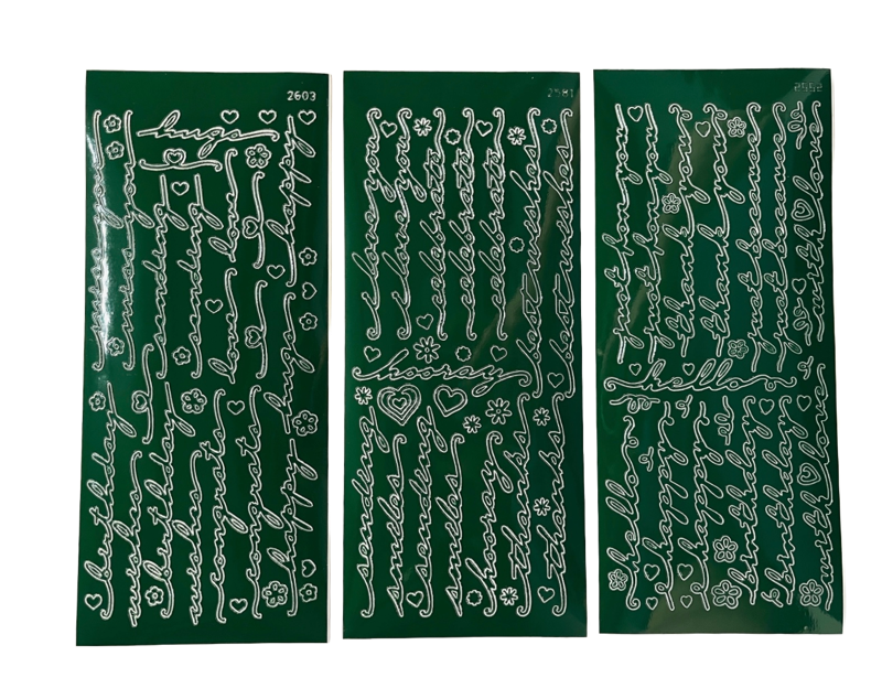 Script Greetings Green Dazzles™ stickers includes 3 sheets with 106 green pieces with whimsical script sentiments, playful hearts, cheerful flowers, and festive stars. With greetings like “hello,” “thank you,” “miss you” and “celebrate” these stickers are perfect for every occasion. These versatile sticker designs bring a heartfelt and polished flair to your scrapbooking, card making, and journaling projects. Available exclusively from Paper Wishes!