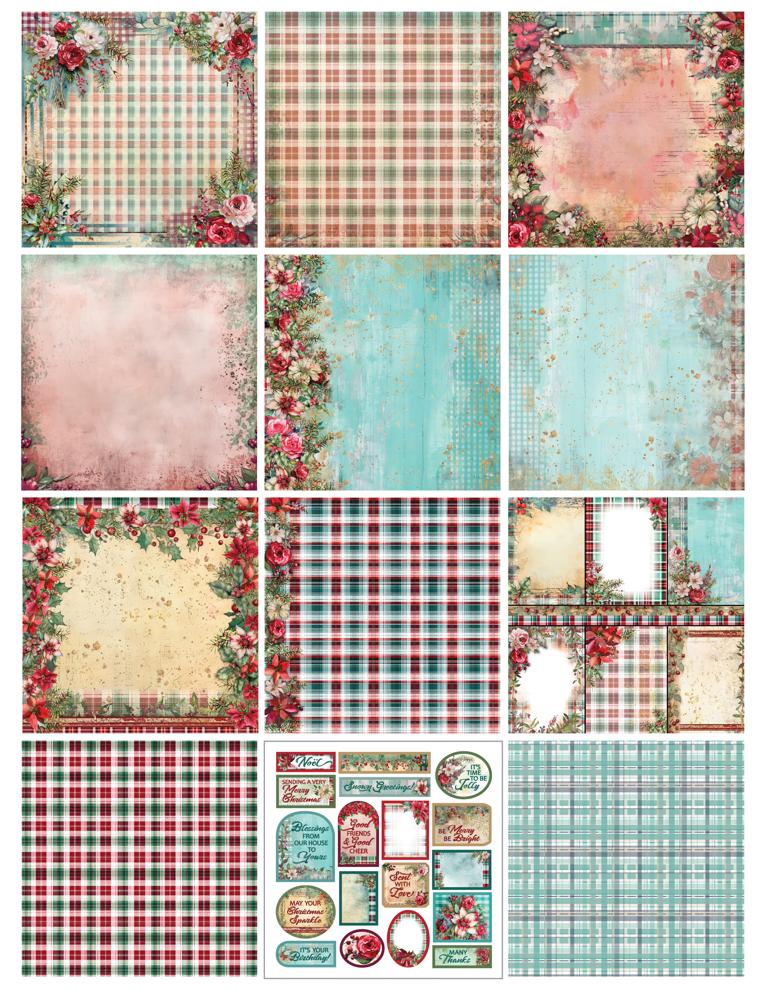 This Christmas Floral Plaids 6x6 Patterned Cardstock is a festive collection of 24 coordinating 6"x6" double-sided sheets, designed to add charm and seasonal flair to your paper crafts. Printed on high-quality 65# cover weight (176gsm) cardstock, this collection features 104 cutouts and a blend of vintage florals and cozy plaid patterns. Acid-free and lignin-free for longevity, the collection brings a playful yet elegant touch to your holiday scrapbooking, card making, and DIY crafting projects. Made in the USA and a Paper Wishes Exclusive!
