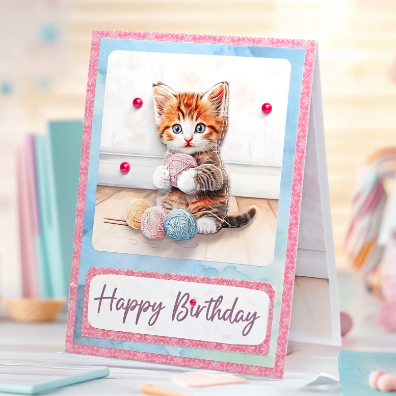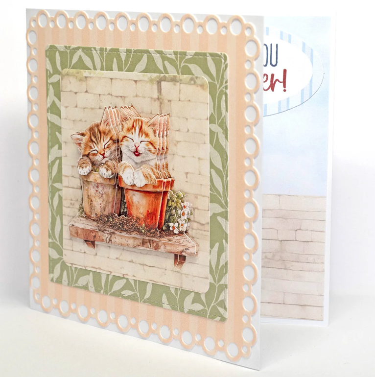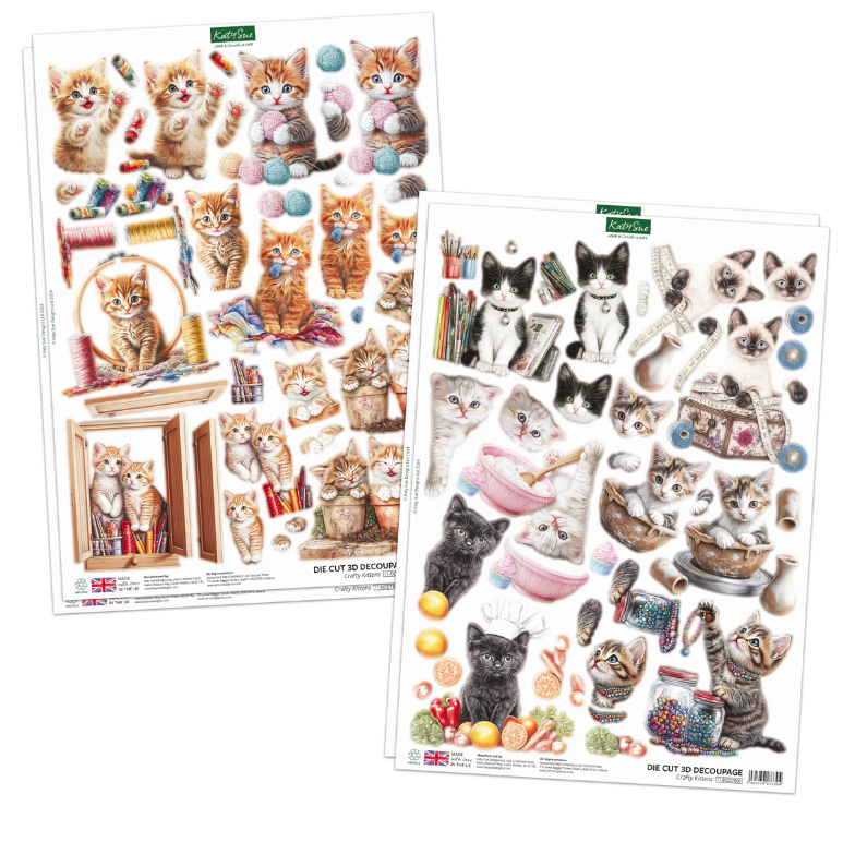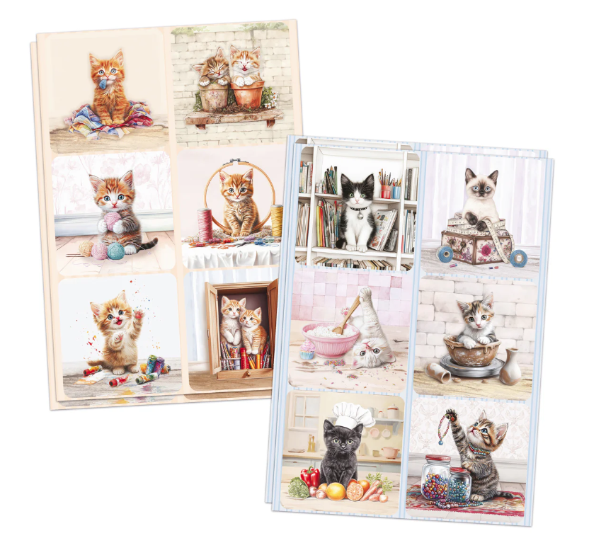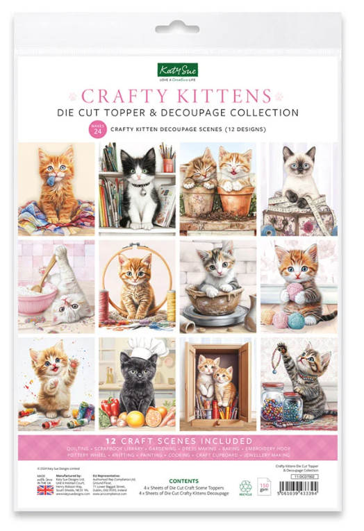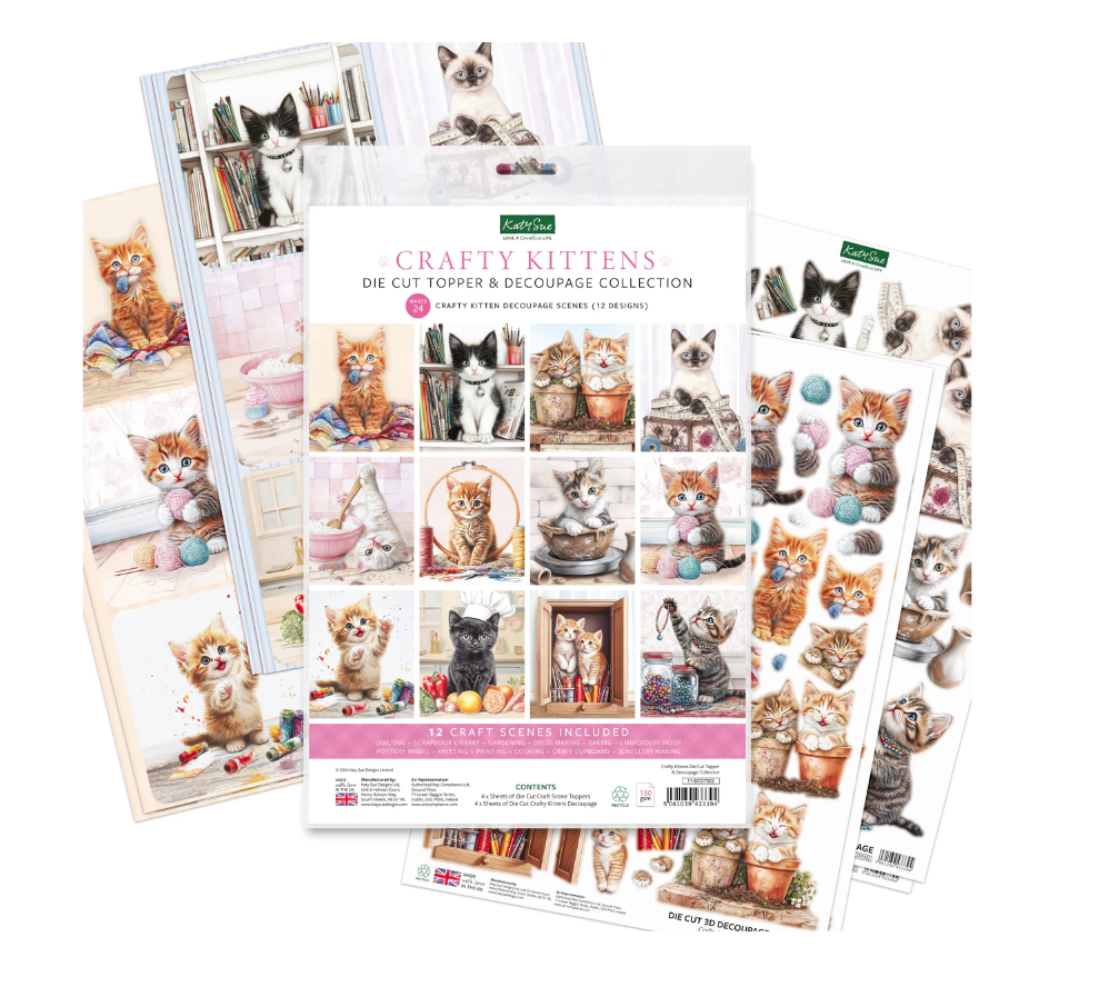 This charming set includes 24 die-cut toppers in 12 unique designs and 4 matching decoupage sheets, all printed on 150gsm paper and made in the UK. Each topper measures 3.5"x3.5" and brings whimsical scenes of crafty cats to life. These fabulous felines are the purr-fect addition to any card making and scrapbooking project, showcasing kitties painting, knitting, quilting, baking, gardening, and more. Whether you're crafting for a cat lover or just love playful, creative designs, these sweet kitties prove that crafting isn't just for humans! Create 24 purr-fectly adorable 3D toppers with the Crafty Kittens Die Cut Topper & Decoupage Collection!