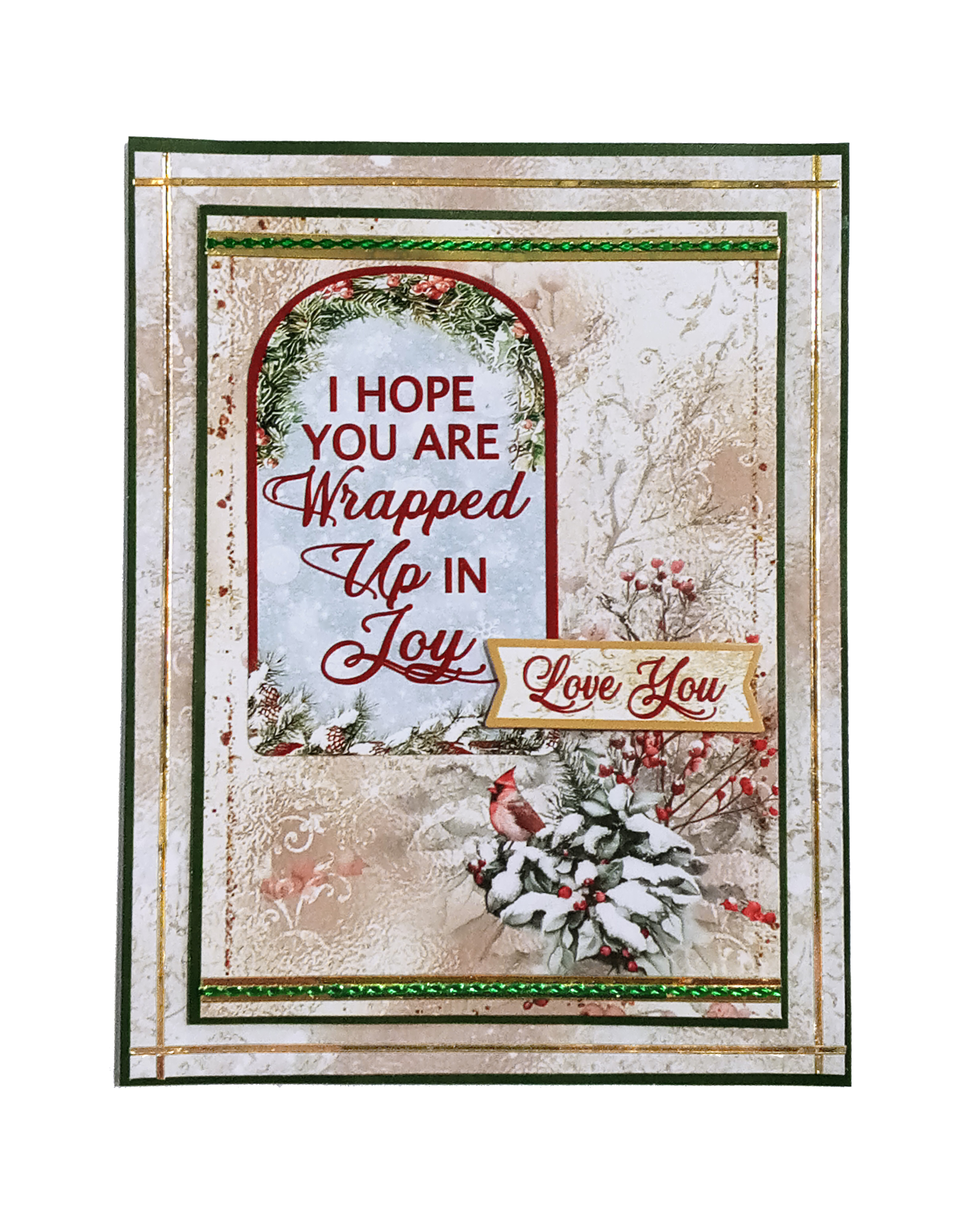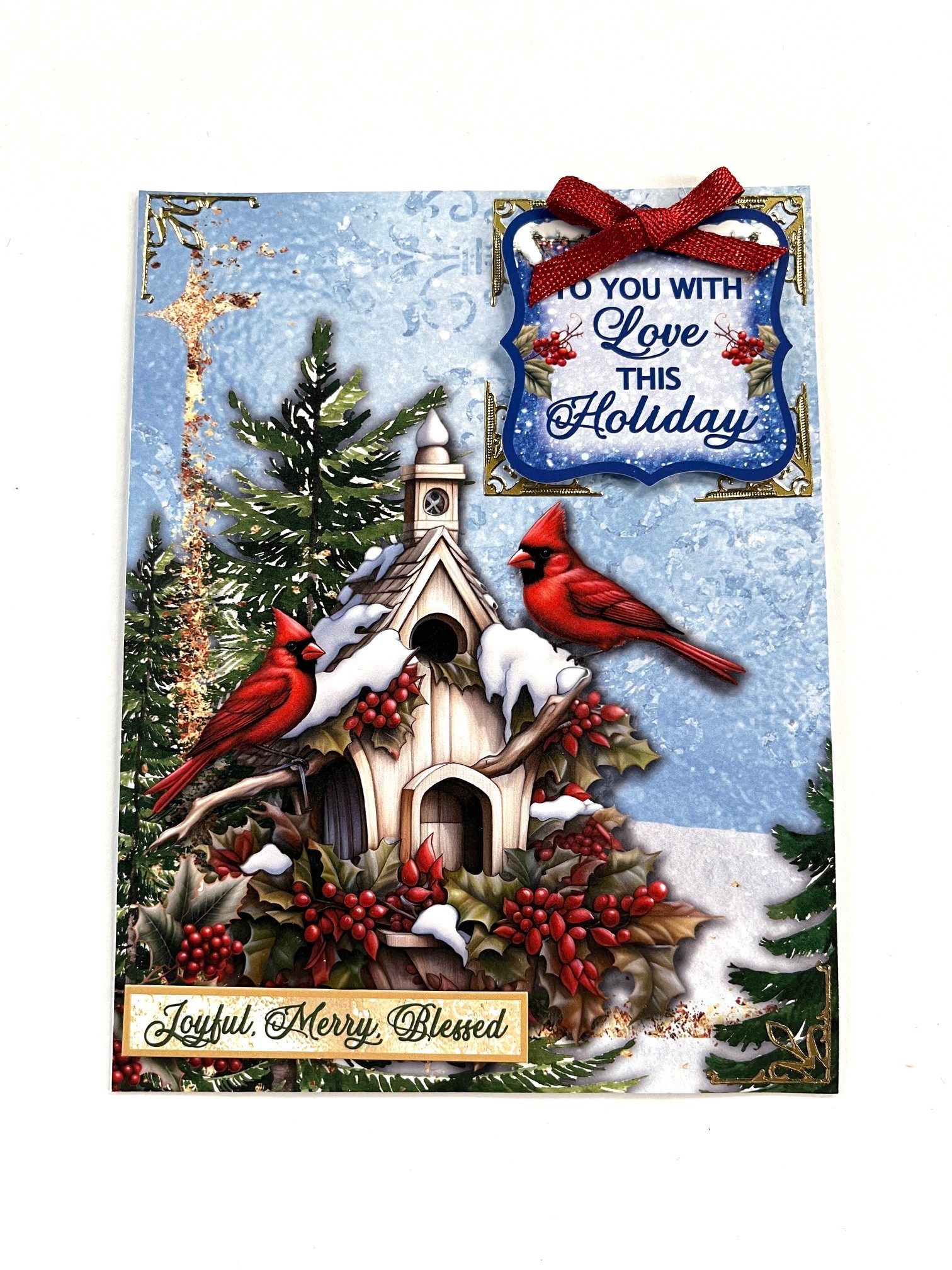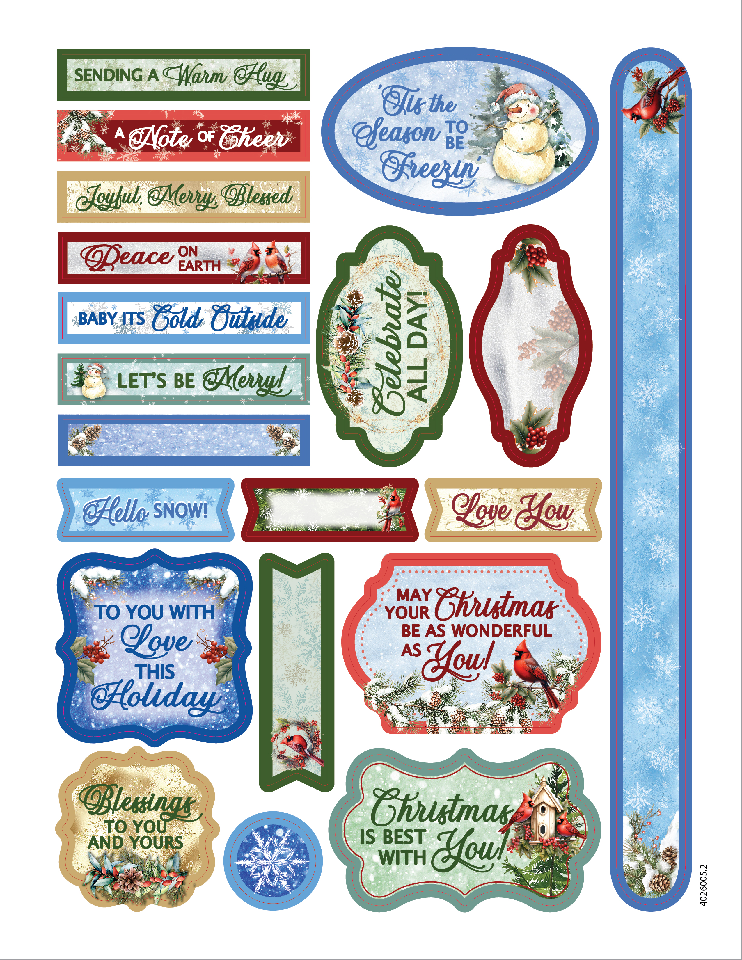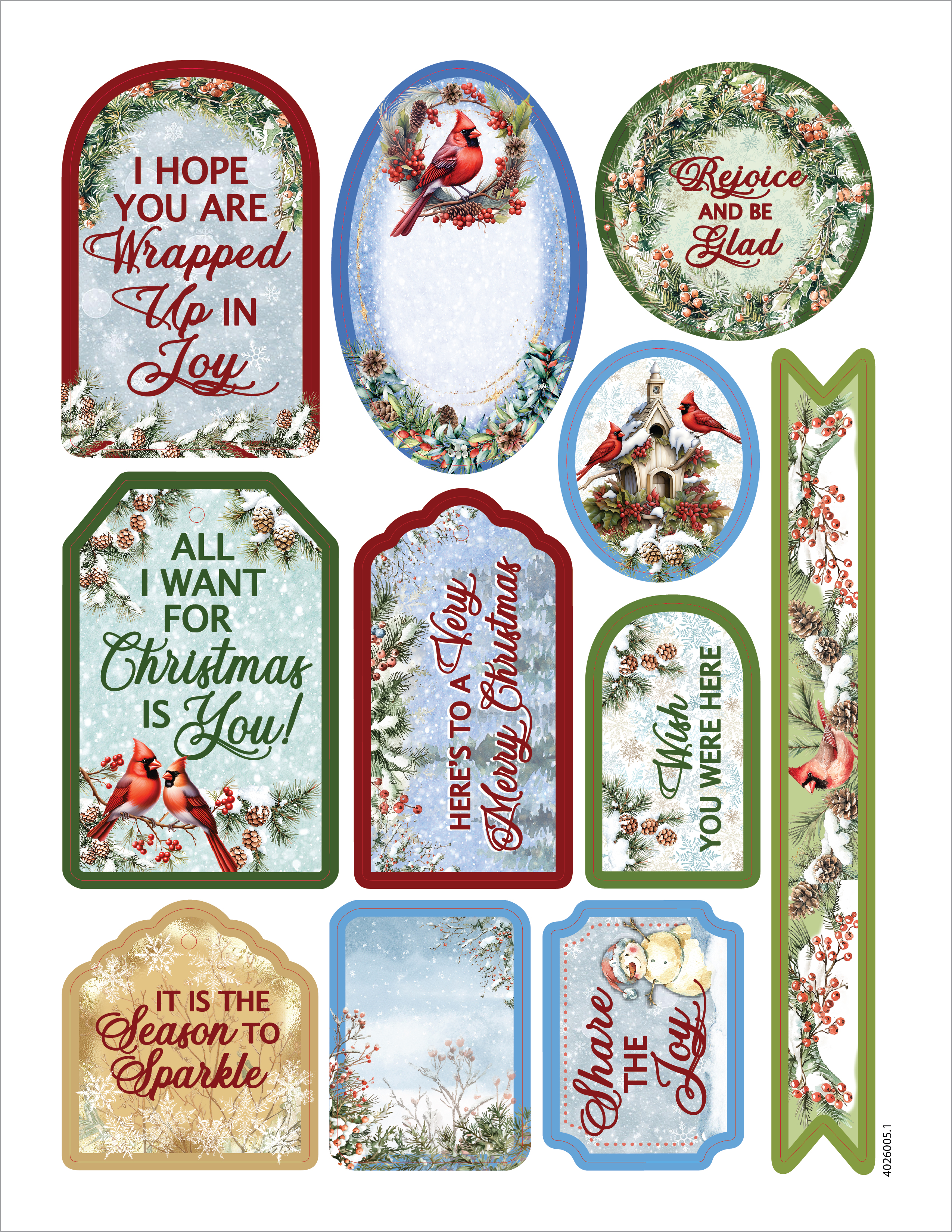 featuring red cardinals, holly sprigs, pinecones, and seasonal sentiments.
