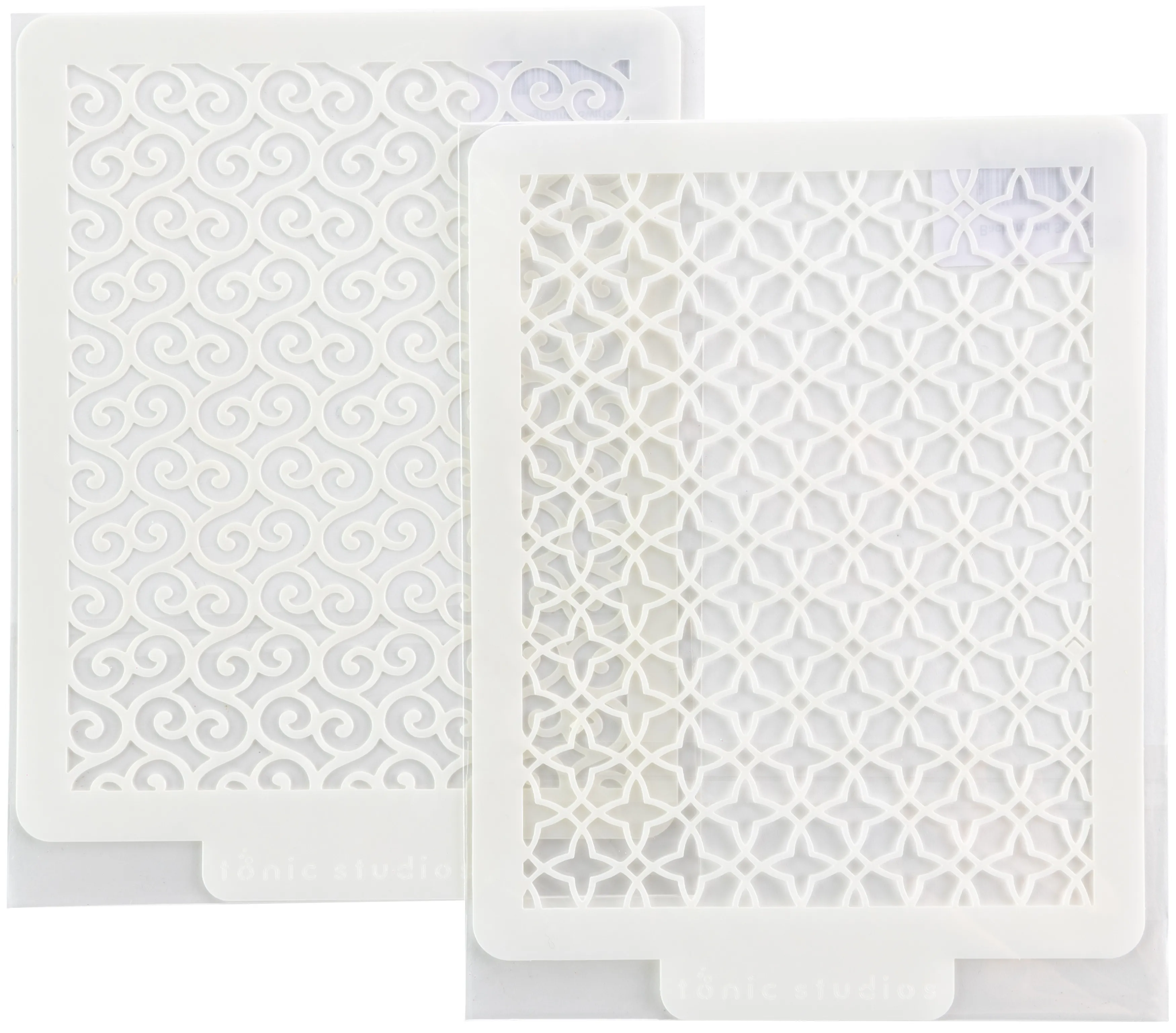 This versatile stencil set from Tonic Studios includes two coordinating designs that blend modern geometry with flowing vintage charm. One stencil features a symmetrical, interlocking lattice pattern, while the second showcases soft, decorative swirl accents. Made from durable, reusable mylar, these stencils are perfect for cardmaking, scrapbooking, mixed media, and junk journal projects. Use them with ink pads and blending brushes for layered color effects. Or run them through die cutting and embossing machines. Create beautiful, dry embossed details. Rearranging and layering the designs adds depth, dimension, and creative freedom to every project.