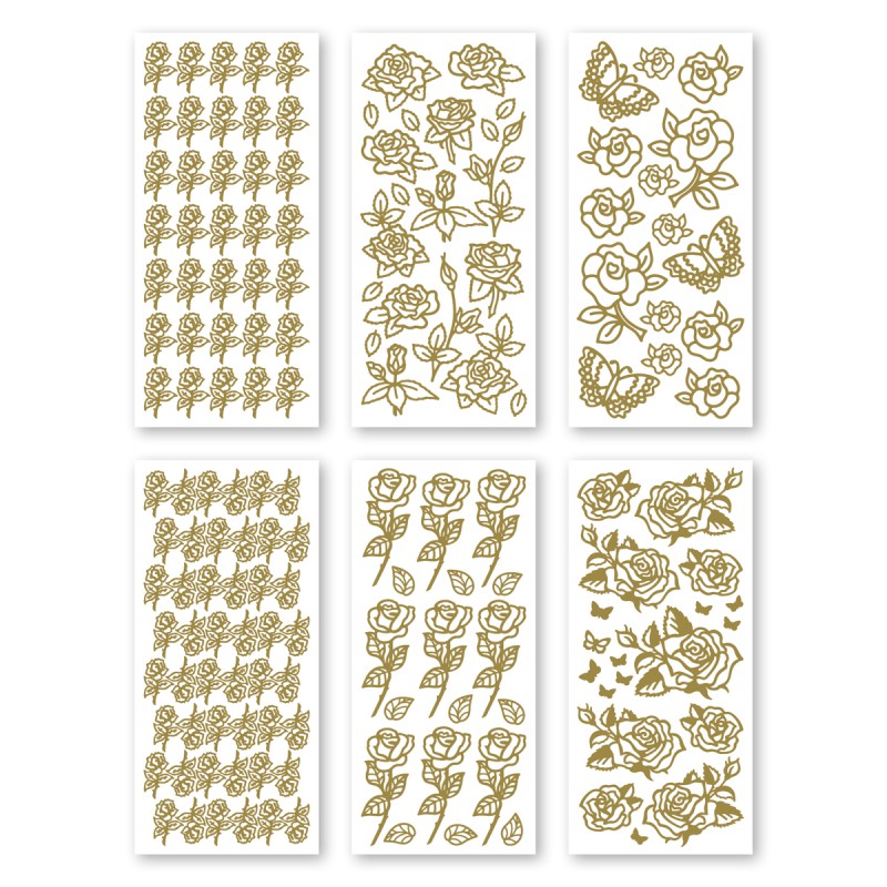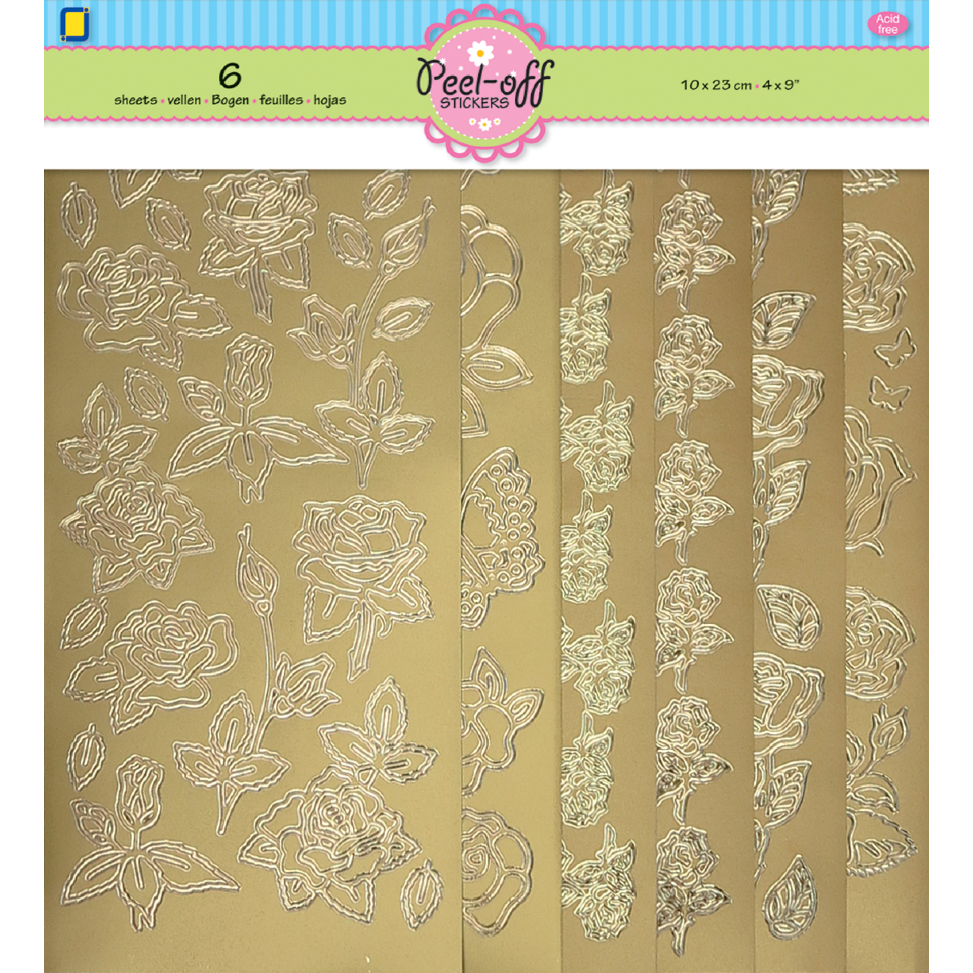 This collection of 6 peel-off stickers measuring 4"x9" showcases 6 designs in gold with unique rose designs, from delicate buds to blooming bouquets. Perfect for card making, scrapbooking, journaling, and other paper crafts, these intricate peel-offs bring a touch of timeless charm and shine to any creation. Add elegant floral accents to your projects with this Roses Peel Off Stickers set! Made in the Netherlands.