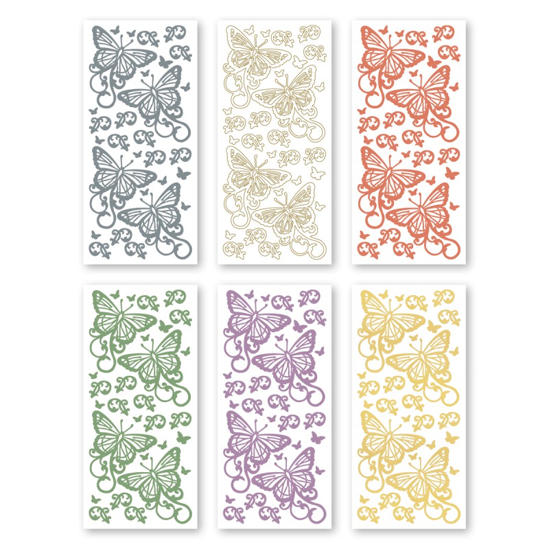 This collection includes 6 Peel Offs Stickers sheets sized at 4"x9", each showcasing the same elegant butterfly design in 6 assorted colors. Perfect for card making, scrapbooking, journaling, and other paper crafts, these stickers add a delicate, whimsical touch to every project. Made in the Netherlands. Bring graceful beauty to your crafts with this Butterflies Peel Off Stickers set!