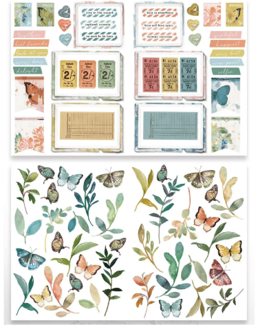 This Page Starters Laser Cuts includes 83 intricately pre-cut pieces to elevate your creative projects. Contained across 2 sheets of 12"x8" (folded to 6"x8" for convenient storage), this set features a beautiful assortment of botanical elements, butterflies, vintage tickets, ledger paper, postage stamps, hearts, and banners. It also includes labels with meaningful phrases like "live in the moment," "captured moments," "we want to be here," "forever memories," "time and time again," "this is everything," "grateful," "happiest," "very best," "new point," "selfie," "together," "best friends," "look at you," "every day," and "delight." Each laser-cut piece is easy to remove and ready to add a charming touch to your scrapbooking, card making, and mixed-media projects. And they are also double sided.