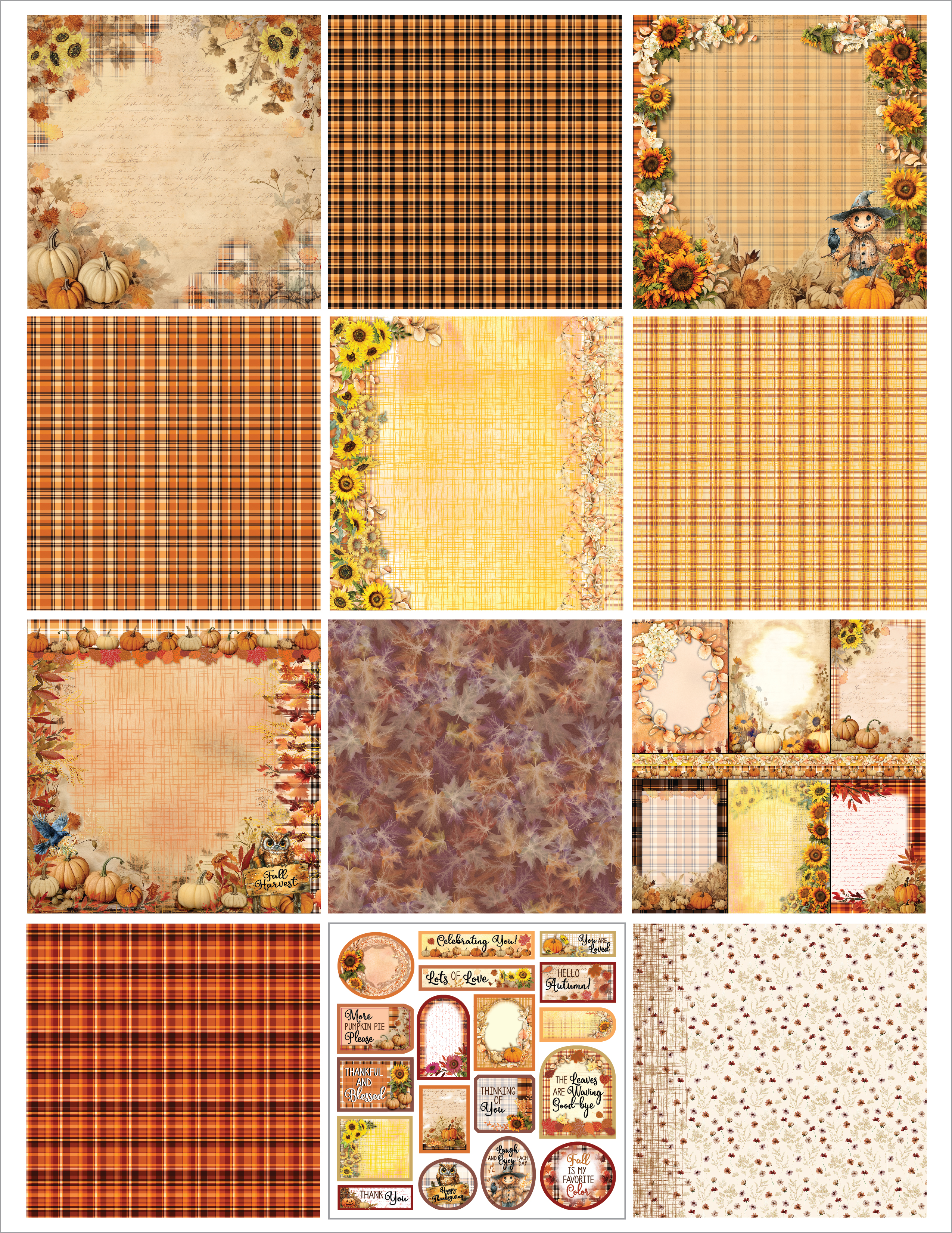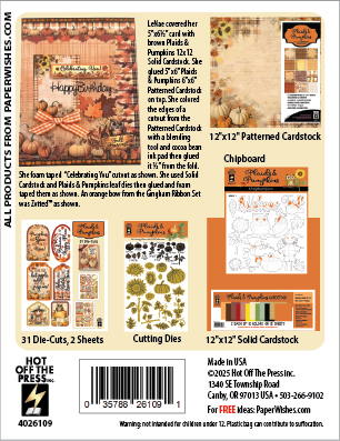 Plaids & Pumpkins 6x6 Patterned Cardstock by Hot Off The Press is loaded! It has 24 double-sided sheets, 104 cutouts with autumn charm, perfect for your next crafting project. Each sheet is a tapestry of rich plaids, whimsical pumpkins, a charming scarecrow and vibrant leaves, capturing the essence of fall with a playful elegance. Whether you're scrapbooking, card making, or making junk journals, this collection infuses warmth and character into every creation. Let your creativity harvest the magic of the season. A Paper Wishes Exclusive!