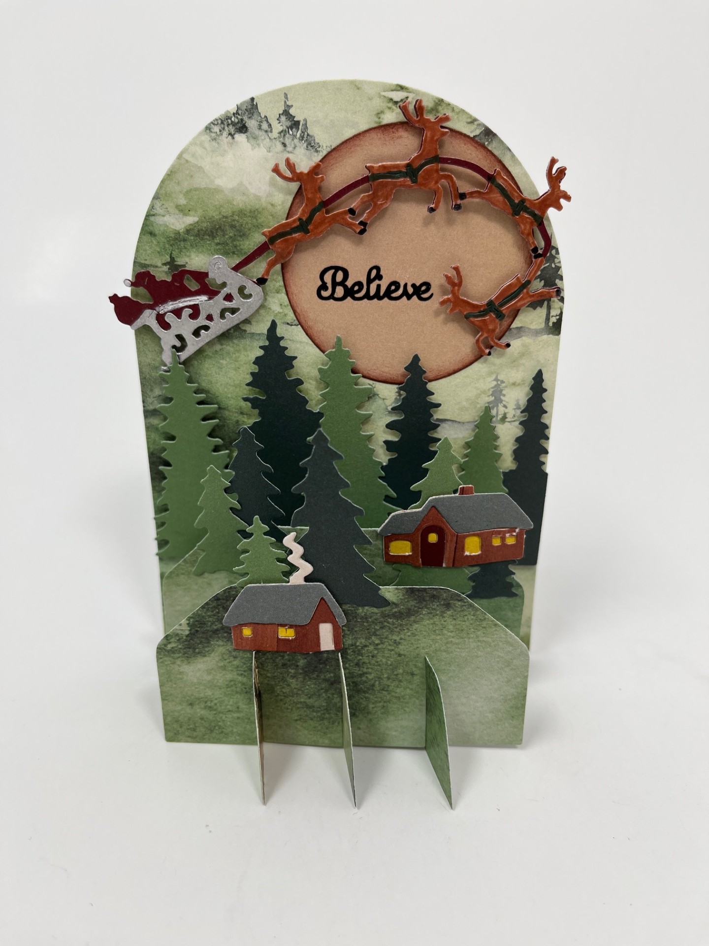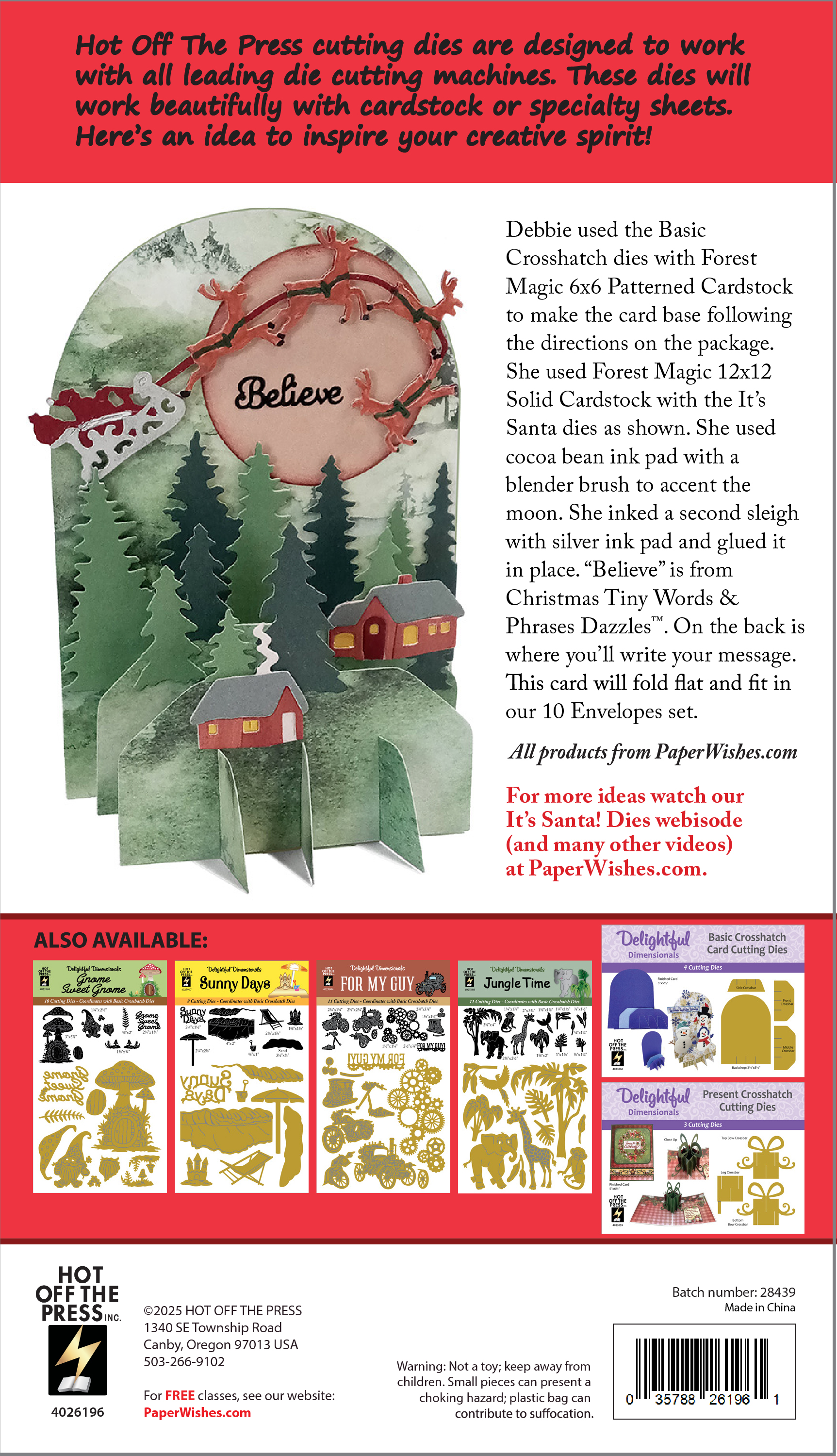 This charming 8-piece set features Santa and his sleigh, cozy cabins, a glowing moon, and layered pine trees. It is perfect for crafting enchanting holiday landscapes. The largest die measures 4"x2½", ideal for building bold, dimensional elements on cards, scrapbook pages, tags, and more. Designed to coordinate seamlessly with the Basic Crosshatch Card Dies, this set makes layering easy and impactful. A sample project with instructions is included on the back of the packaging to inspire your creativity. Use with
