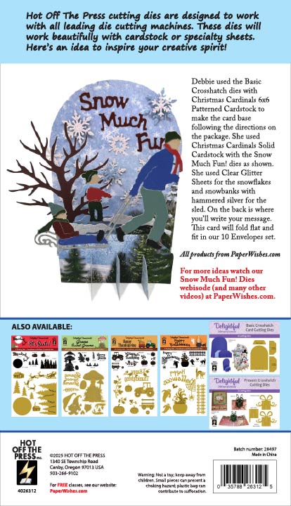 Featuring playful sledding figures, a bare winter tree, delicate snowflakes, a snow bank and the festive “Snow Much Fun!” sentiment, these dies are perfect for cardmaking, scrapbooking, and mixed media projects. Use with your favorite die-cutting machine for crisp, detailed cuts every time. While these work beautifully with the Basic Crosshatch dies, they will also make wonderful regular cards and pages. Be sure to watch the webisode for ideas!