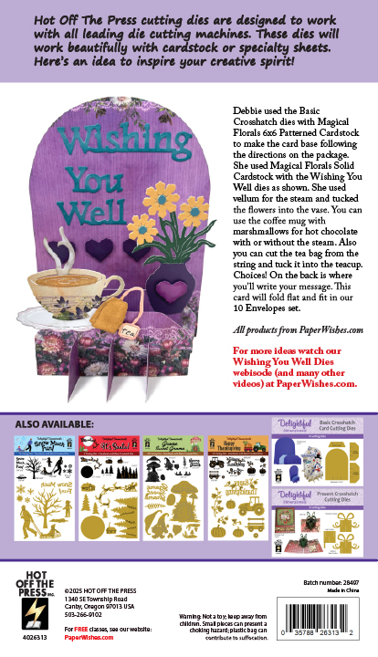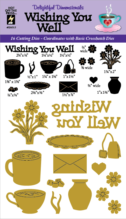 Bring heartfelt charm to your handmade cards and paper crafts with the Wishing You Well Cutting Dies from Hot Off The Press. This versatile set includes 16 intricately designed dies that let you create dimensional elements like teacups, mugs, flowers, envelopes, hearts, and a thoughtful “Wishing You Well” sentiment. Perfect for get-well cards, friendship notes, and warm greetings. You can tuck the flowers into the vase, the teabag into the cup and marshmallows into the steaming hot chocolate mug because slits are provied in the dies. Plus you'll find many uses for that charming envelope including adding a heart on it. These dies coordinate beautifully with Basic Crosshatch Dies for layered effects. Craft elegant designs featuring cozy tea themes, floral arrangements, and decorative accents. Ideal for card makers, scrapbookers, and DIY enthusiasts, these dies work with most leading die-cutting machines including the Big Shot, making it easy to add professional detail to any project.