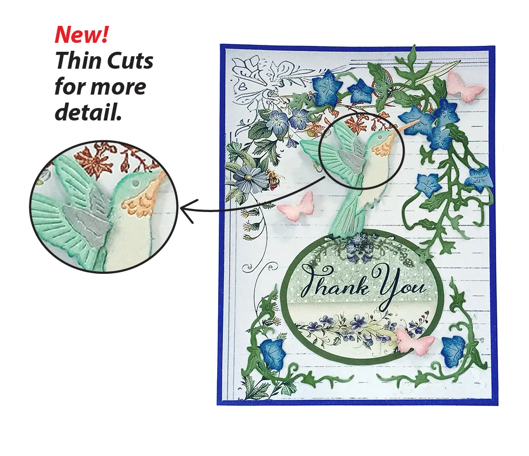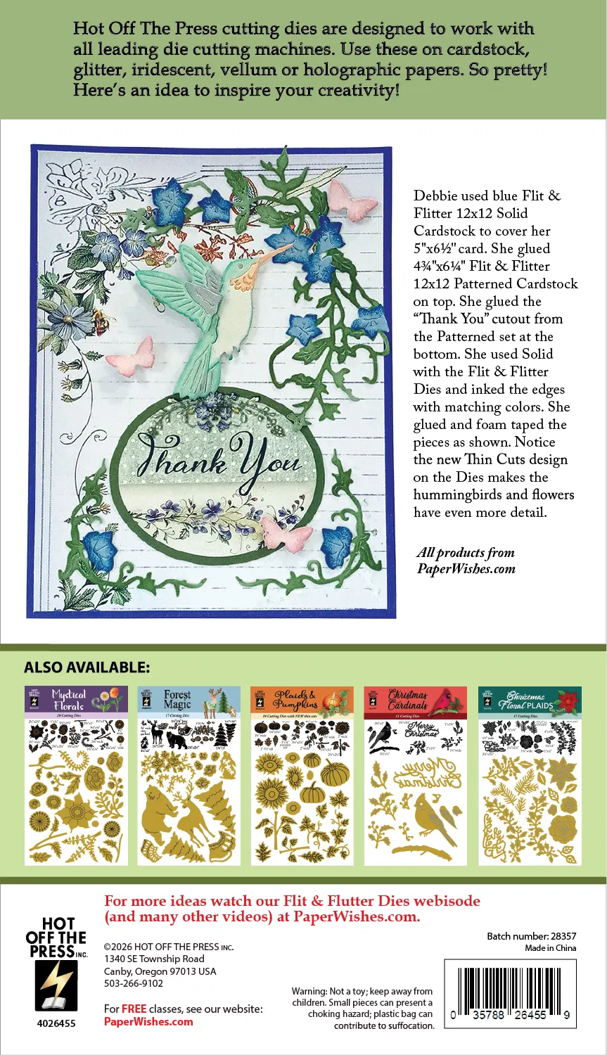 Create stunning nature-inspired designs with the Flit & Flutter Cutting Dies! This versatile set includes 19 thin metal dies featuring graceful hummingbirds, butterflies, and delicate floral accents—perfect for card making, scrapbooking, and mixed media projects. These dies feature the new Thin Cut design, giving your finished pieces incredible detail and a professional look! See the Flit & Flutter webisode for creative ideas, including the card shown on the package.