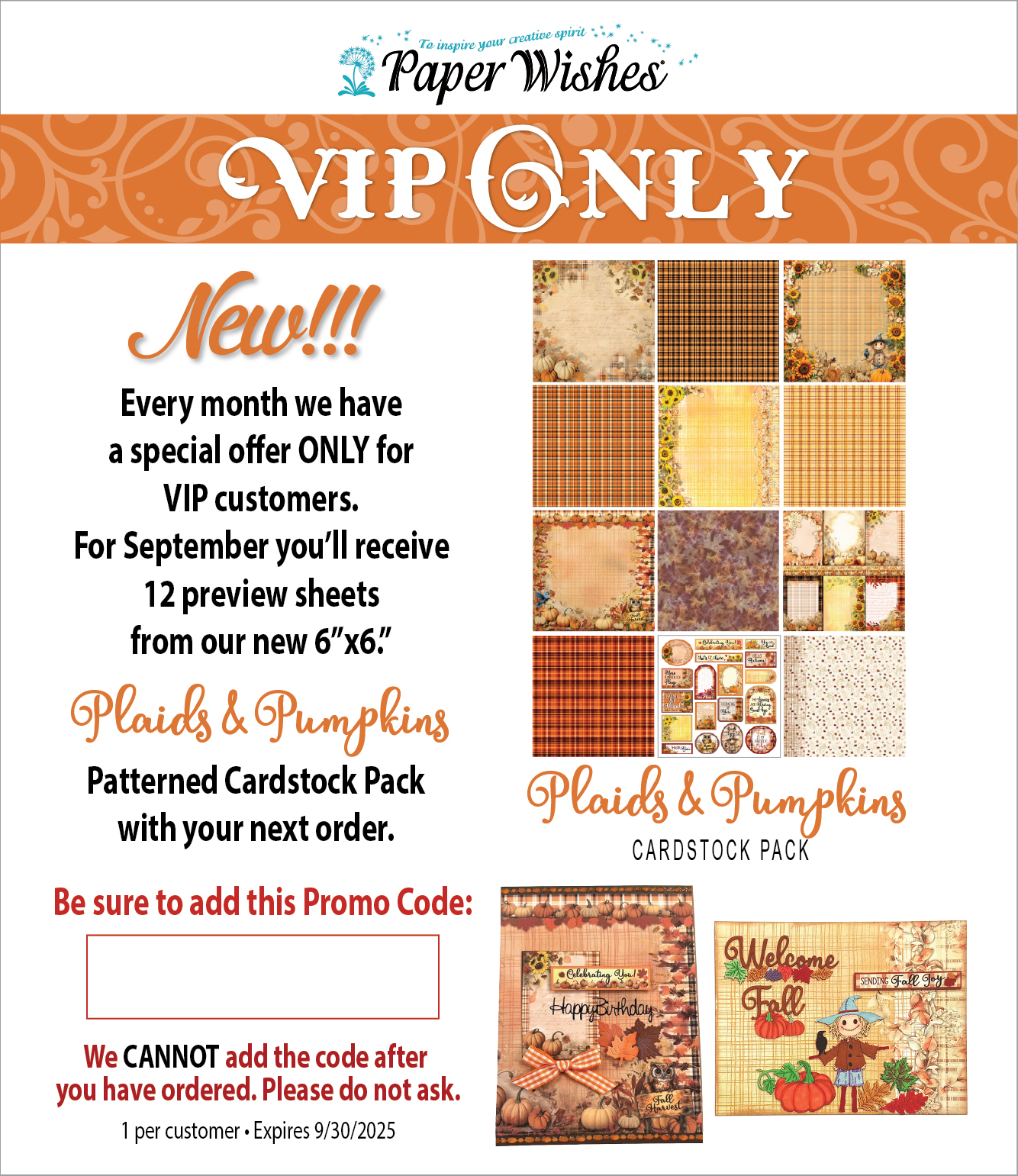 When your orders reach a total of $500 over the previous 12 months, we’ll designate you a Paper Wishes VIP. Then each month we’ll send an email offering something free with your next order. You don’t have to do anything to qualify as this will be automatically calculated. The VIP list is updated monthly and the email goes out the beginning of the month with a special code. The free item is only valid once per month and it changes every month. Surprises are always fun!