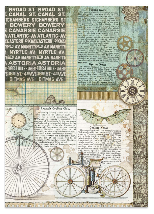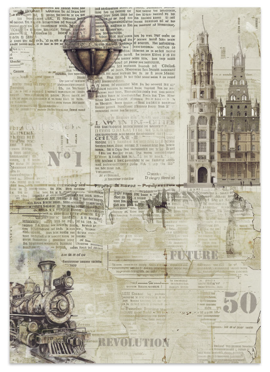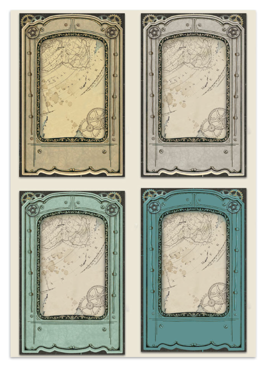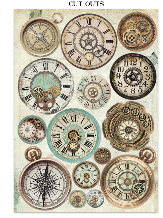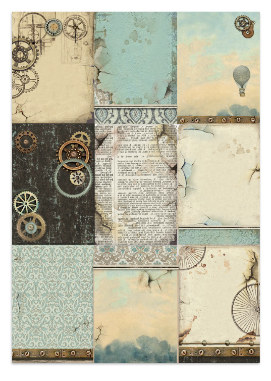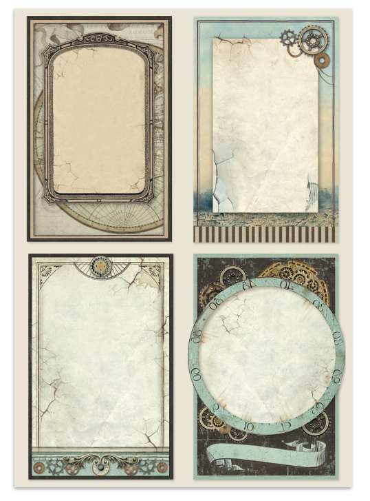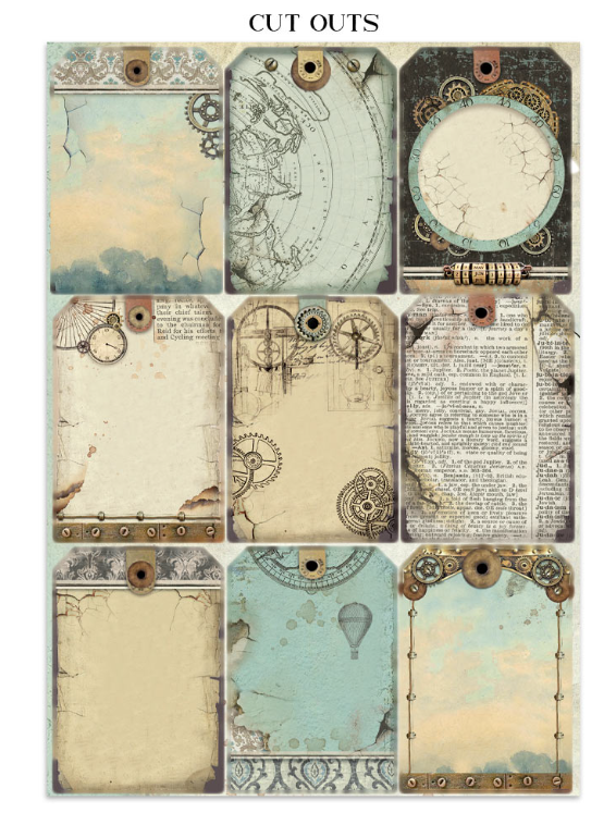 Rich steampunk imagery: gears, clocks, airships, and vintage ephemera