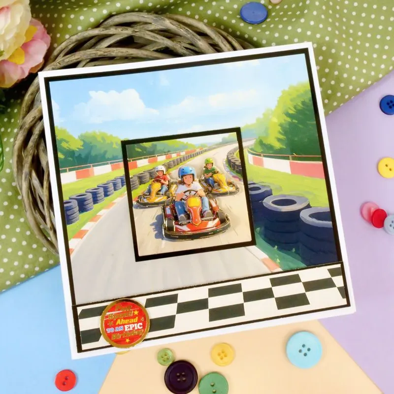 Perfect for teenage-themed projects, this sheet features vibrant artwork of a theme park and friends racing in go-karts—ideal for birthdays, celebrations, and special days to remember. Each sheet includes die-cut elements with rich gold foil and watercolour-style designs, allowing you to create two complete shaped decoupage toppers with ease. Simply pop out the pieces and foam tape for instant dimension and wow factor.
