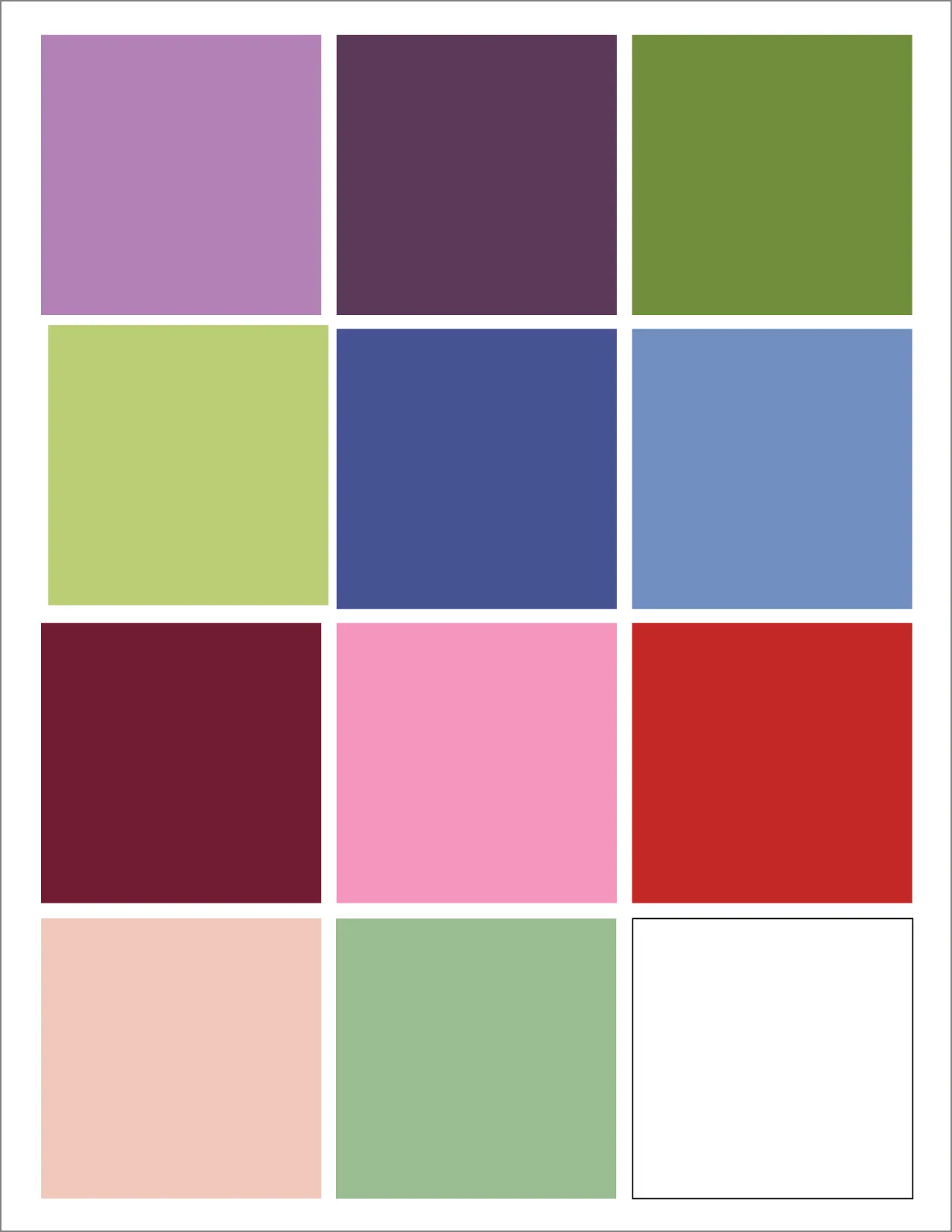 A harmonious mix of warm and cool tones: lavender, plum, olive green, soft lime, navy, periwinkle, burgundy, blush pink, cherry red, peach, sage, and white.