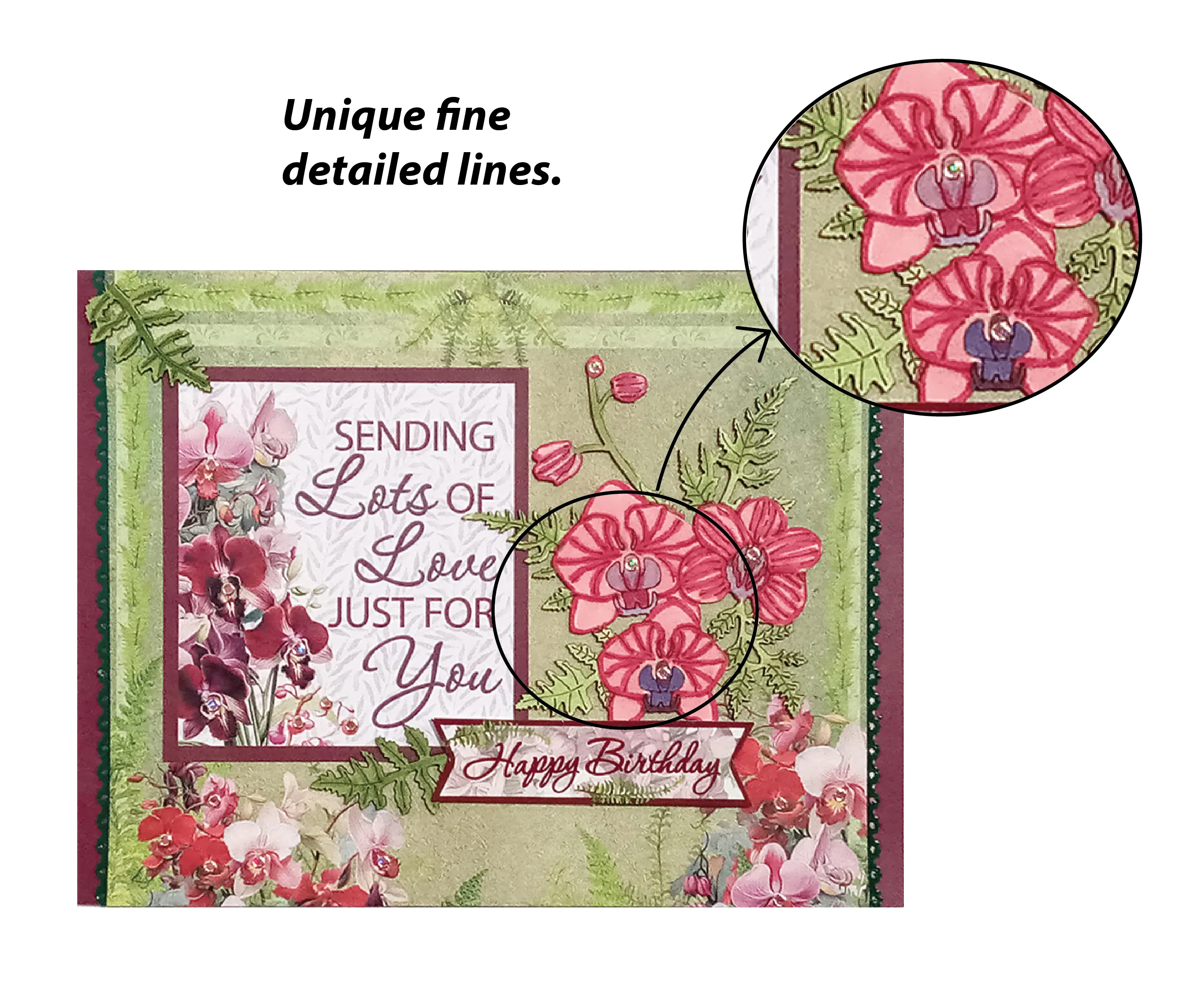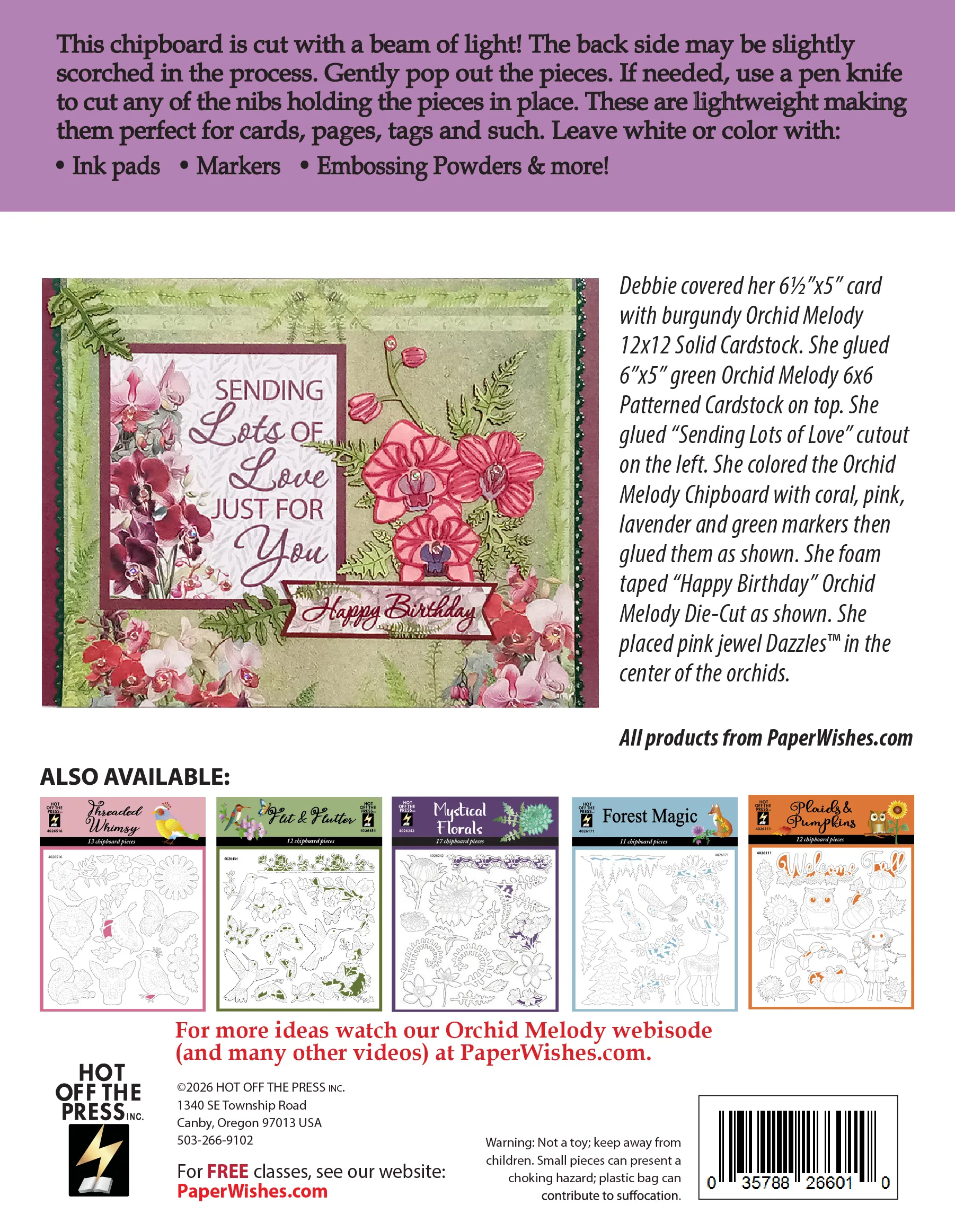 Add elegant dimension to your handmade projects with the Orchid Melody Chipboard Set. These beautifully detailed laser‑cut pieces feature graceful orchids, delicate ferns, and lush botanical accents—perfect for card making, scrapbooking, mixed‑media art, journals, and more. Each design coordinates seamlessly with the entire Orchid Melody collection, giving your creations a cohesive, polished look. Notice the images have detailed engraved art which makes coloring them with markers or ink pads so very easy.