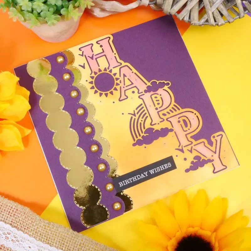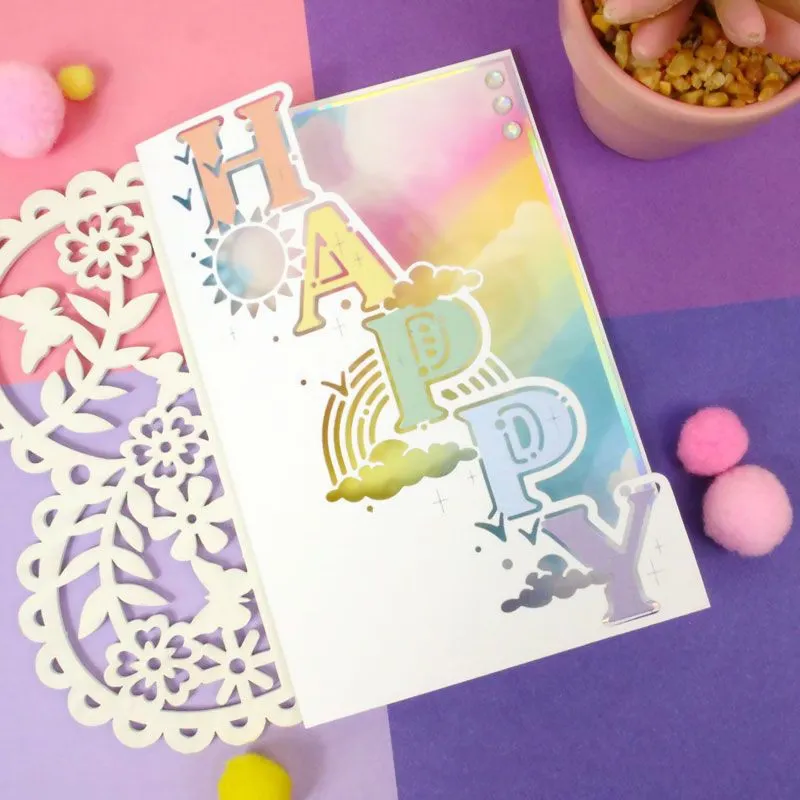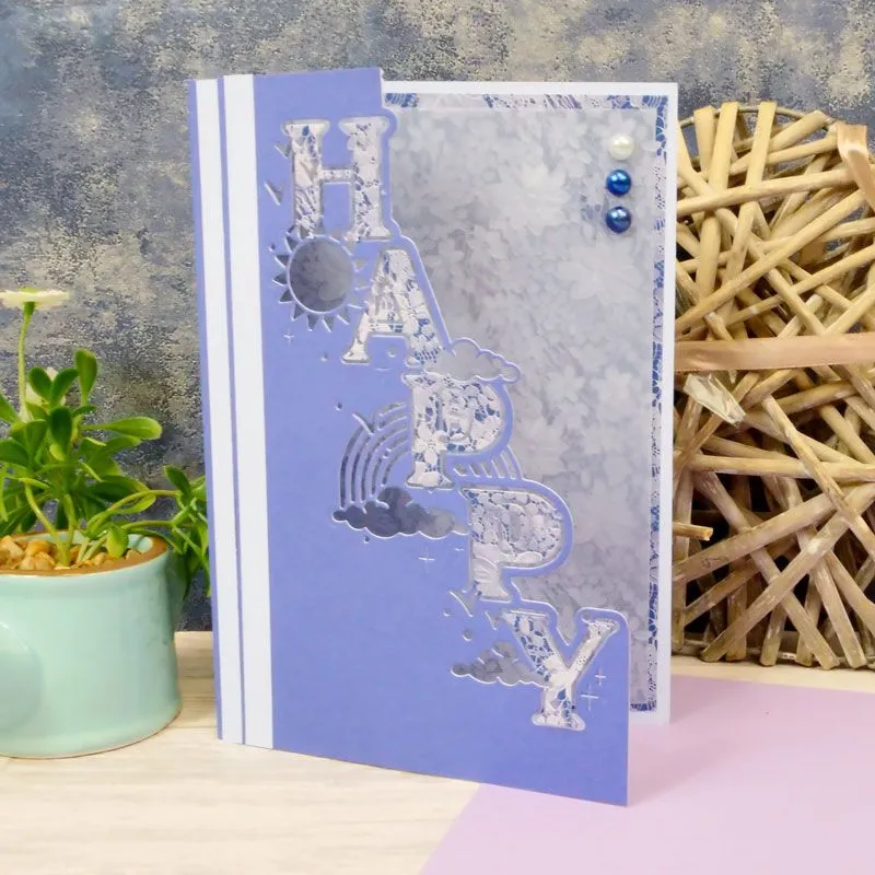 The design features the word ‘Happy’ in a classic serif font, surrounded by sunshine, clouds, and a rainbow, accented with dots and sparkle. Perfect for birthdays, celebrations, and cheerful greetings, this versatile die lets you craft unique, eye-catching cards effortlessly.