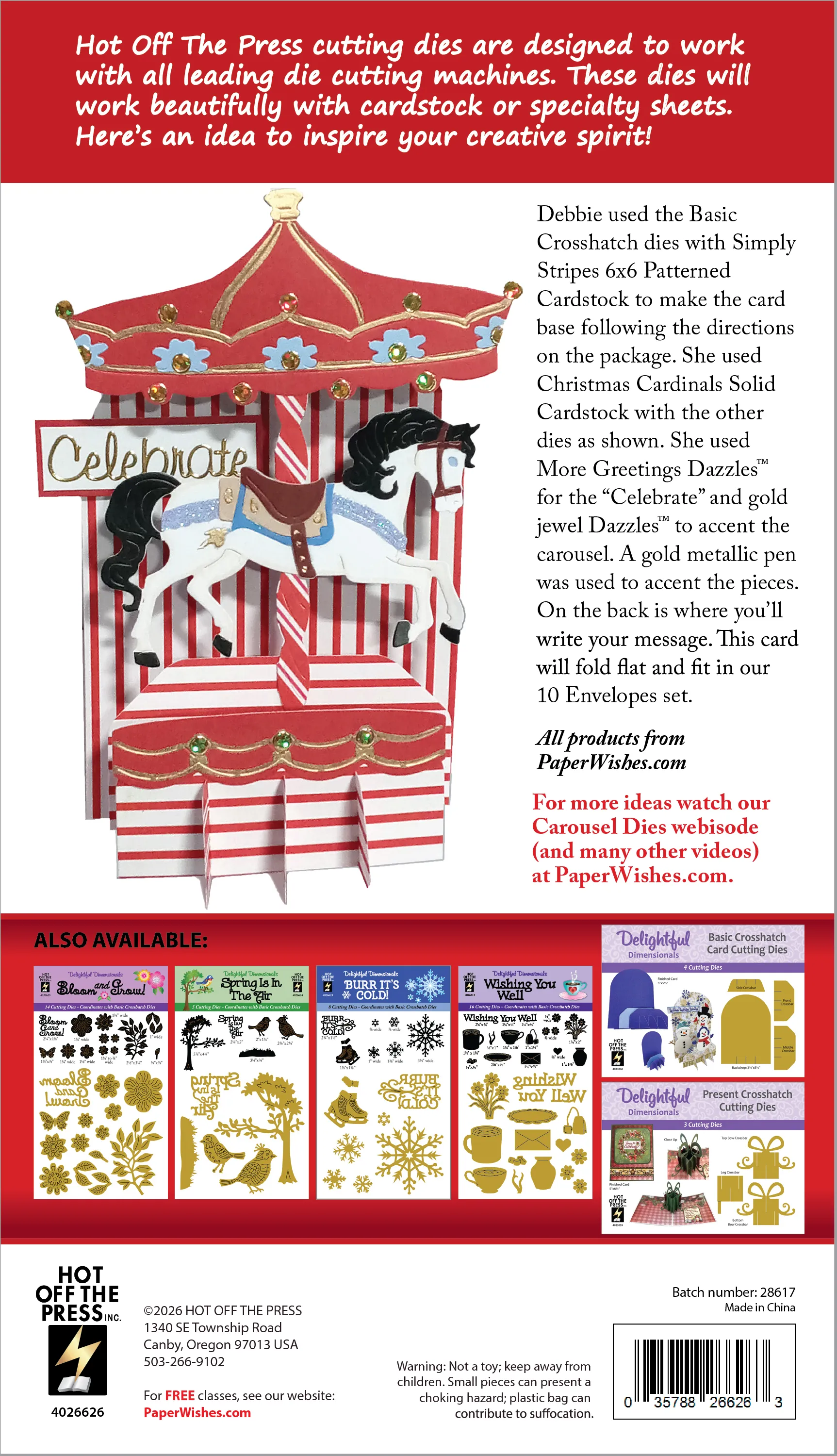 The Delightful Dimensionals Carousel die set features beautifully detailed carousel horses, canopy elements, decorative trims, and twisted poles that come together to build stunning layered designs. Perfect for card making, scrapbooking, mixed media, and junk journal projects. While these dies coordinate seamlessly with Basic Crosshatch Dies they are perfect on a flat card, too. Cut from heavyweight cardstock, patterned paper, or specialty finishes to create eye-catching focal points with a classic fairground feel. Paper Wishes exclusive!