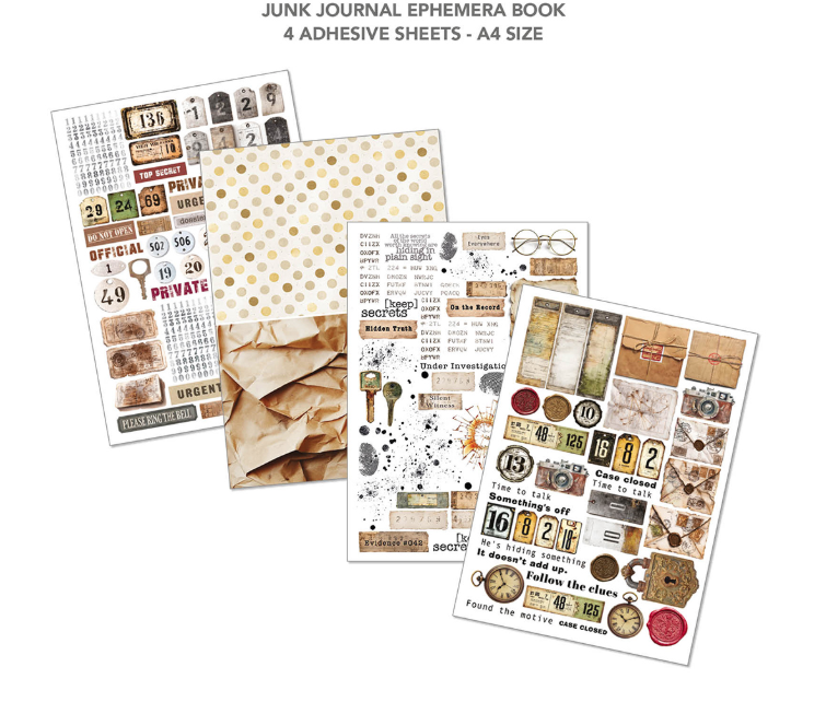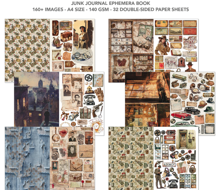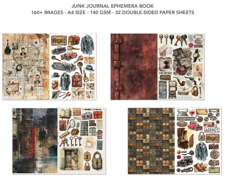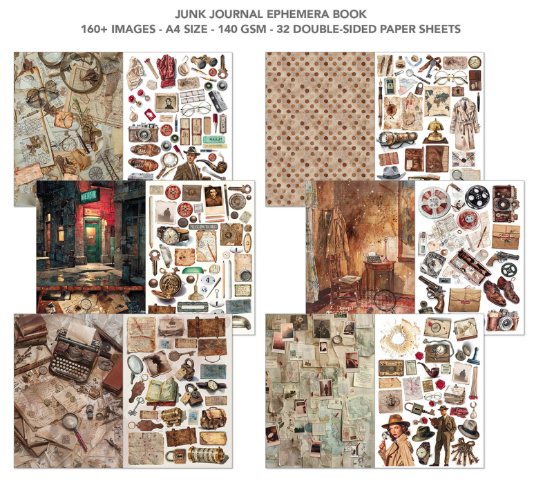 Includes 32 double-sided A4 sheets with over 160 images, plus 4 transparent adhesive pages. The set has a fun, vintage feel with a mystery and detective theme, showcasing detectives, vintage magnifying glasses, phones, typewriters, and cameras—plus so much more. No other pad offers more embellishments for your projects! In its handy 8-1/4x11-3/4 inches (A4) format. Ideal for junk journals, collage, scrapbooking, card making, and paper craft art!