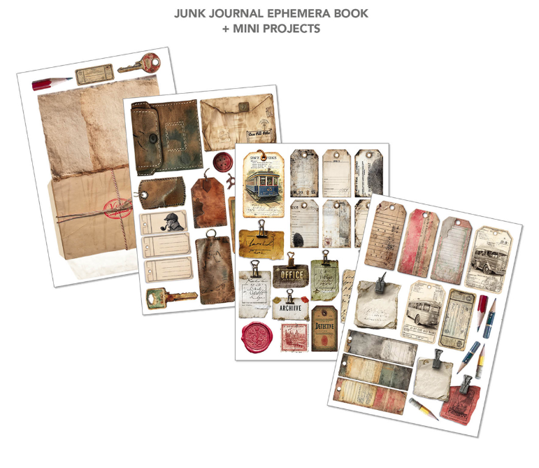 The Last Mystery Junk Journal & Ephemera Book is a special resource for cards, tags, postal stamps, medallions, labels, sentiments, and other creative elements.
