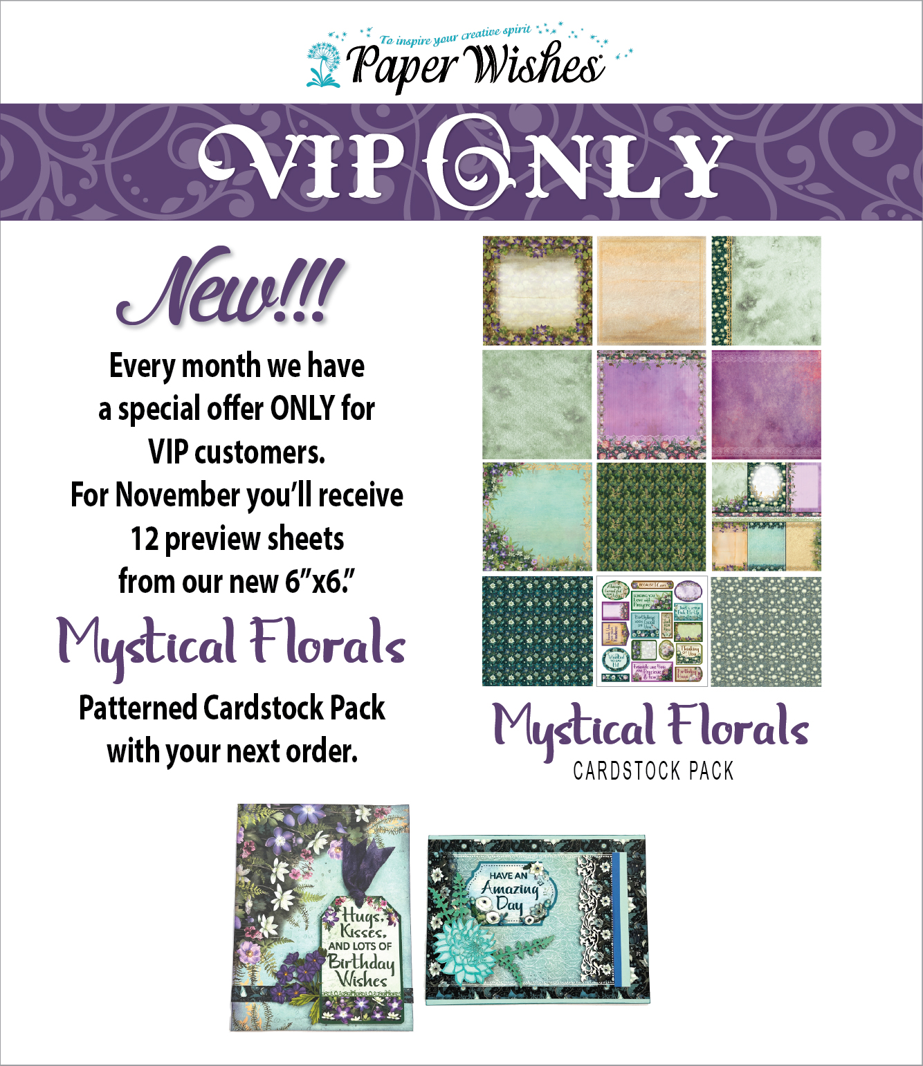 When your orders reach a total of $500 over the previous 12 months, we’ll designate you a Paper Wishes VIP. Then each month we’ll send an email offering something free with your next order. You don’t have to do anything to qualify as this will be automatically calculated. The VIP list is updated monthly and the email goes out the beginning of the month with a special code. The free item is only valid once per month and it changes every month. Surprises are always fun!