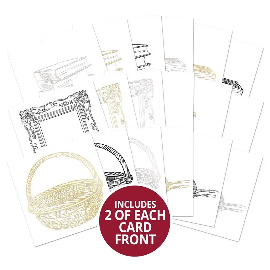 A variety of charming vintage-themed illustrations such as a classic ornate frame, a stack of books, elegant vases, woven baskets, a rustic wooden crate, and an old-fashioned wheelbarrow. Each design is available in your choice of rich gold foil, stunning silver foil, or stylish black print, all printed onto 250gsm Ink Me! cardstock. This makes them ideal for ink blending, stamping, distressing, or adding creative mixed-media touches.