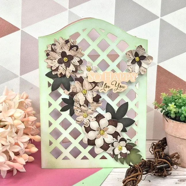 - 4 designs: 5x5 inch, 7x5 inch,4.13x5.83 inch (A6), and 3.9x8.3 inches slimline trellis cards