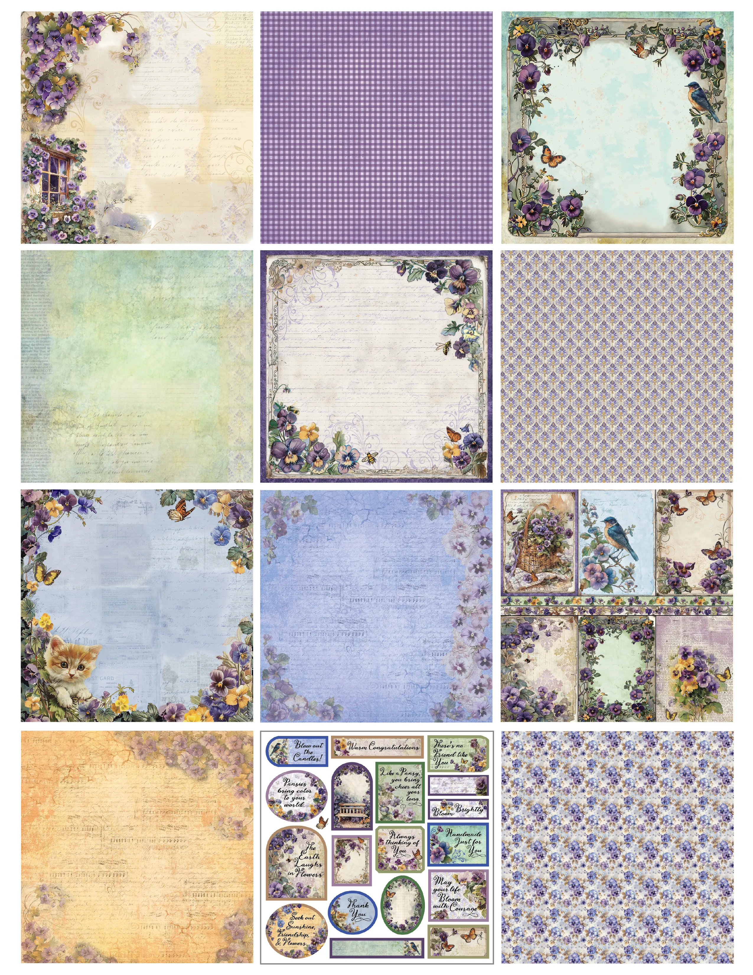 Capture the beauty of handwritten memories, delicate florals, and vintage elegance with the Pansy Notes 12"x12" Patterned Cardstock Collection. Featuring soft pansy florals, antique script, faded textures, butterflies, and coordinating pastel patterns, this collection is perfect for card making, scrapbooking, junk journals, mini albums, tags, and mixed media creations. Paper Wishes exclusive.
