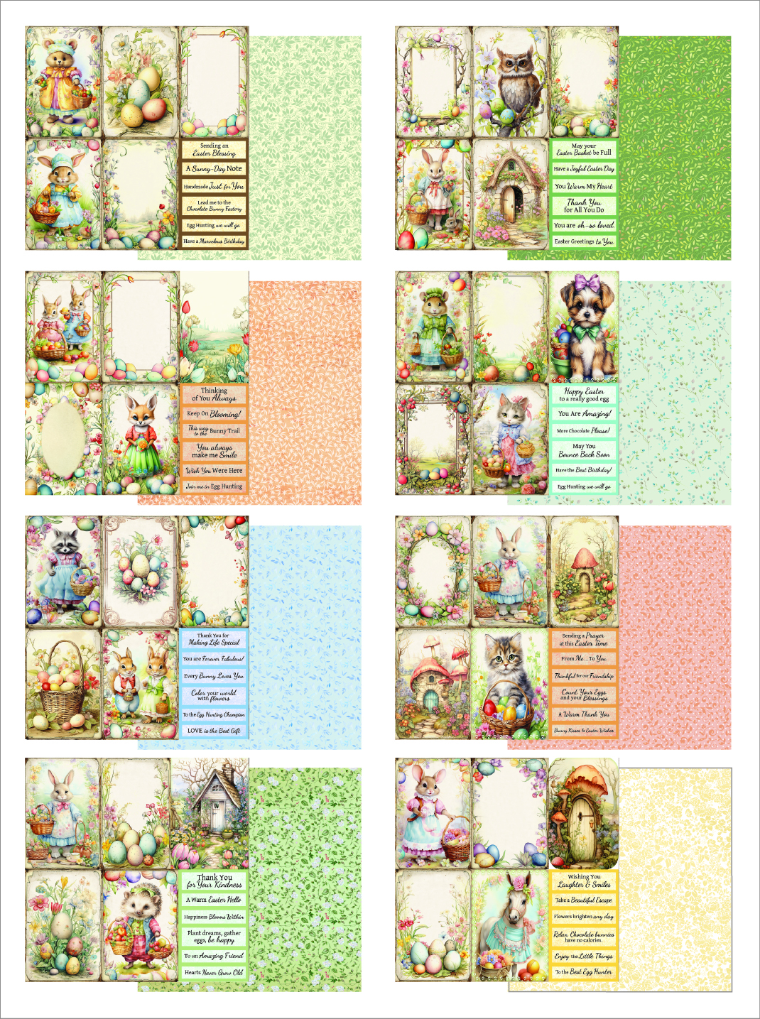 - Features bunnies, baskets, eggs, florals, and woodland scenes