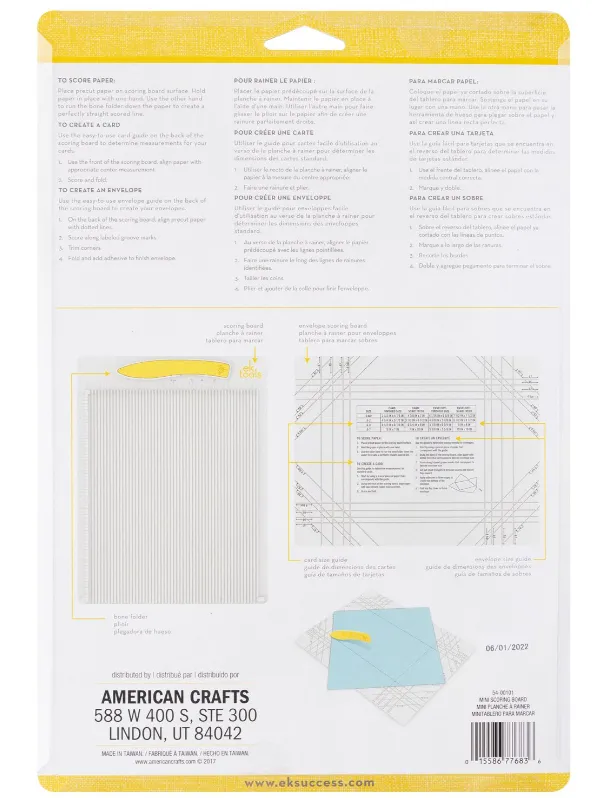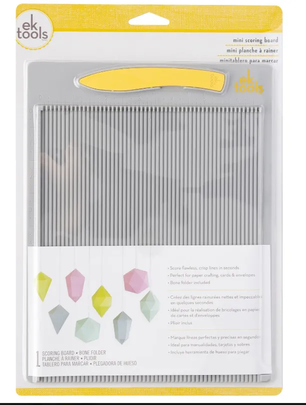 This compact scoring board is perfect for creating cards, invitations, envelopes, and decorative paper crafts. Designed for precision and ease, it helps you achieve professional results every time. A bone folder is part of the set. On the back of the board there is a guide for making different sized cards and for creating envelopes, too.