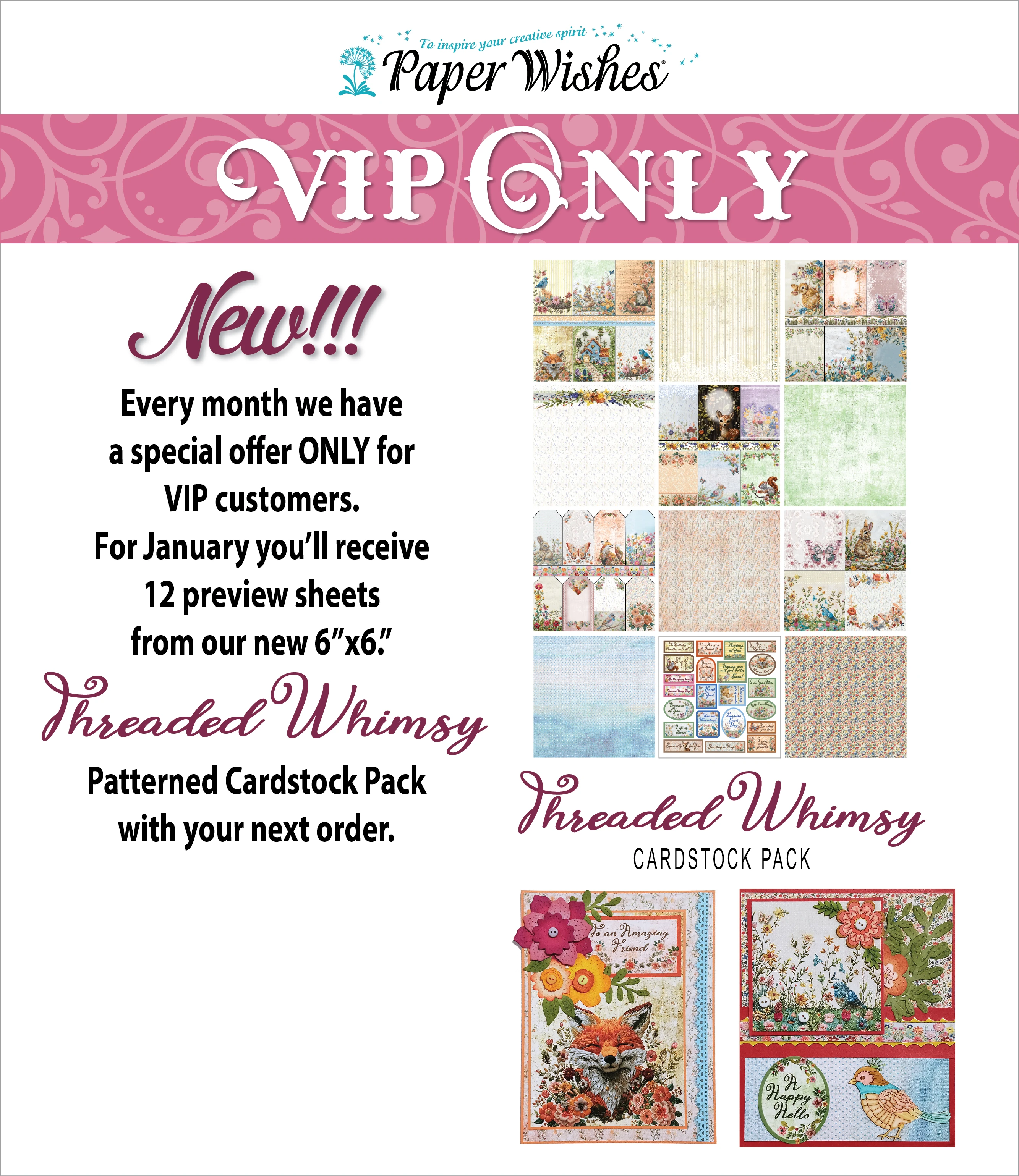 When your orders reach a total of $500 over the previous 12 months, we’ll designate you a Paper Wishes VIP. Then each month we’ll send an email offering something free with your next order. You don’t have to do anything to qualify as this will be automatically calculated. The VIP list is updated monthly and the email goes out the beginning of the month with a special code. The free item is only valid once per month and it changes every month. Surprises are always fun!
