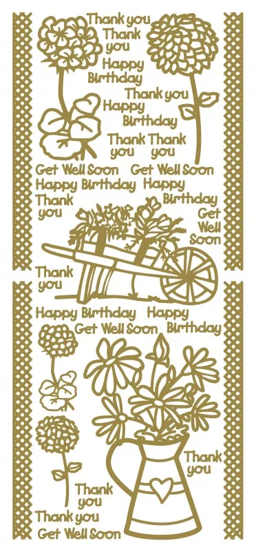 Add elegance, warmth, and charm to handmade cards, scrapbooks, journals, and creative projects with this beautifully detailed floral-themed Dazzles™ sticker sheet. Featuring gold-outlined flowers, a blooming wheelbarrow, and a cheerful pitcher arrangement, this sheet also includes versatile sentiments perfect for birthdays, thank-you notes, and get‑well greetings.