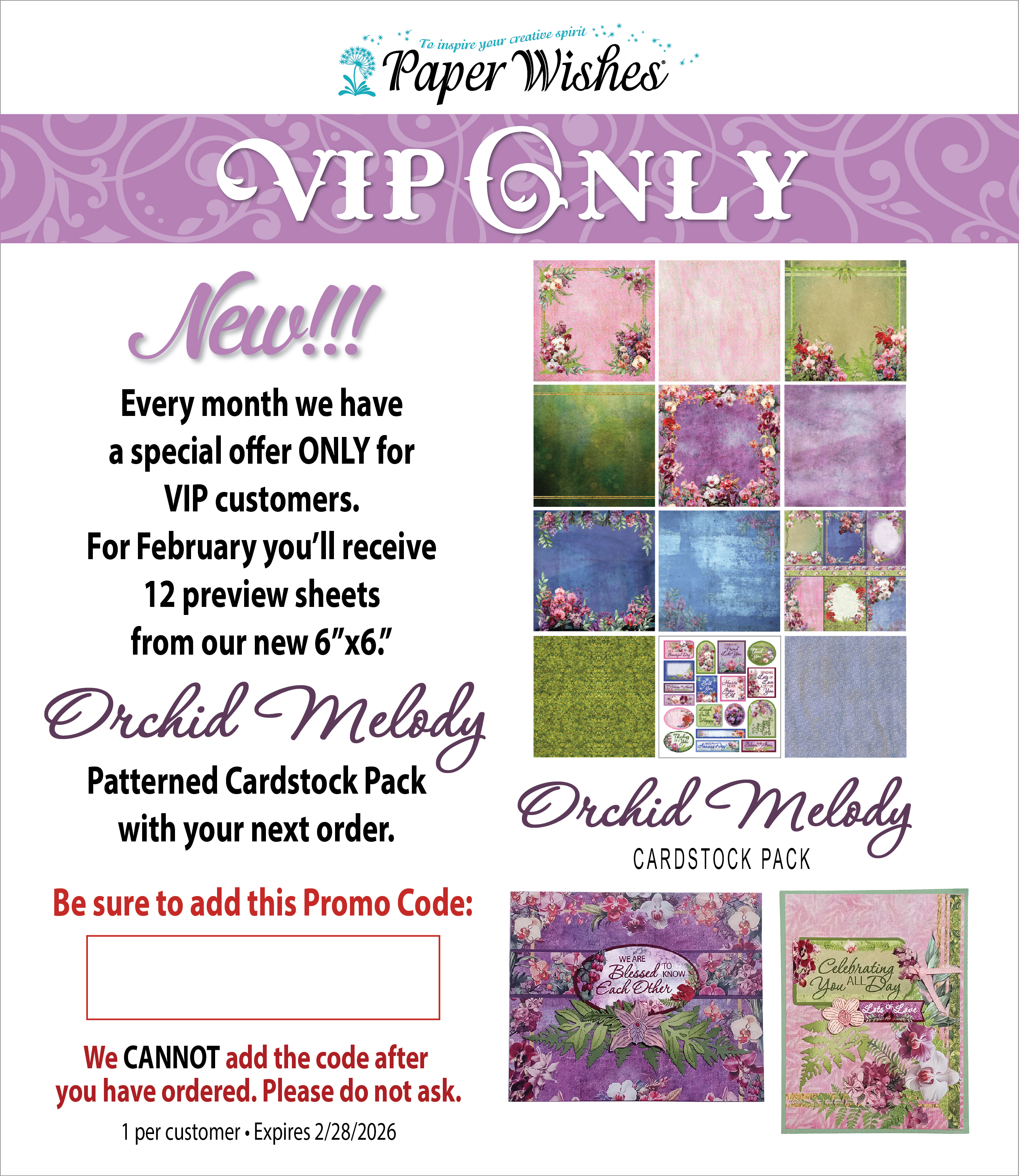 When your orders reach a total of $500 over the previous 12 months, we’ll designate you a Paper Wishes VIP. Then each month we’ll send an email offering something free with your next order. You don’t have to do anything to qualify as this will be automatically calculated. The VIP list is updated monthly and the email goes out the beginning of the month with a special code. The free item is only valid once per month and it changes every month. Surprises are always fun!