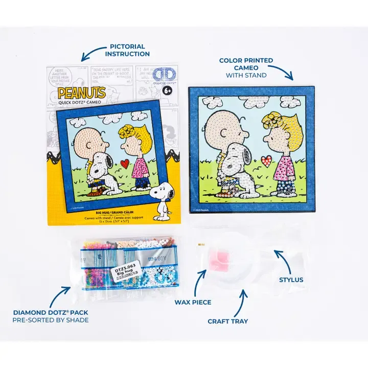 Share the love with the Peanuts Big Hug Diamond Painting Topper by Diamond Dotz™! This sweet, beginner‑friendly diamond painting project captures an adorable moment between Snoopy and Charlie Brown sharing a warm, heartfelt hug. It’s a fast, easy, and uplifting craft that’s perfect for kids, Peanuts fans, or anyone who enjoys feel‑good creative activities. If you're new to diamond painting, see the video on the bottom of the home page under All the Basics.